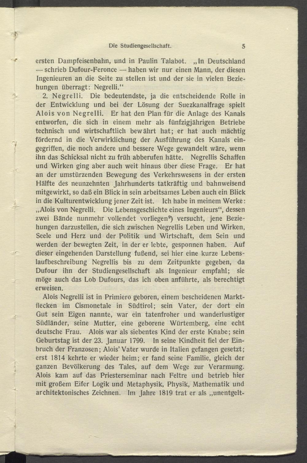 2. Negrelli. Die bedeutendste, ja die entscheidende Rolle in der Entwicklung und bei der Lösung der Suezkanalfrage spielt Alois von Negrelli. Er hat den Plan für die Anlage des Kanals entworfen, die sich in einem mehr als fünfzigjährigen Betriebe technisch und wirtschaftlich bewährt hat; er hat auch mächtig fördernd in die Verwirklichung der Ausführung des Kanals eingegriffen, die noch andere und bessere Wege gewandelt wäre, wenn ihn das Schicksal nicht zu früh abberufen hätte. Negrellis Schaffen und Wirken ging aber auch weit hinaus über diese Frage. Er hat an der umstürzenden Bewegung des Verkehrswesens in der ersten Hälfte des neunzehnten Jahrhunderts tatkräftig und bahnweisend mitgewirkt, so daß ein Blick in sein arbeitsames Leben auch ein Blick in die Kulturentwicklung jener Zeit ist. Ich habe in meinem Werke: „Alois von Negrelli. Die Lebensgeschichte eines Ingenieurs“, dessen zwei Bände nunmehr vollendet vorliegen 9 ) versucht, jene Beziehungen darzustellen, die sich zwischen Negrellis Leben und Wirken, Seele und Herz und der Politik und Wirtschaft, dem Sein und werden der bewegten Zeit, in der er lebte, gesponnen haben. Auf dieser eingehenden Darstellung fußend, sei hier eine kurze Lebenslaufbeschreibung Negrellis bis zu dem Zeitpunkte gegeben, da Dufour ihn der Studiengesellschaft als Ingenieur empfahl; sie möge auch das Lob Dufours, das ich oben anführte, als berechtigt erweisen.