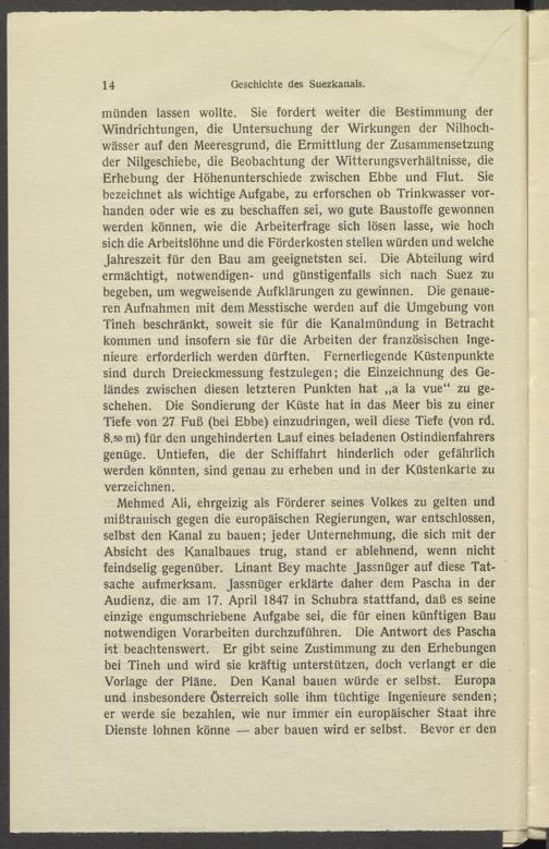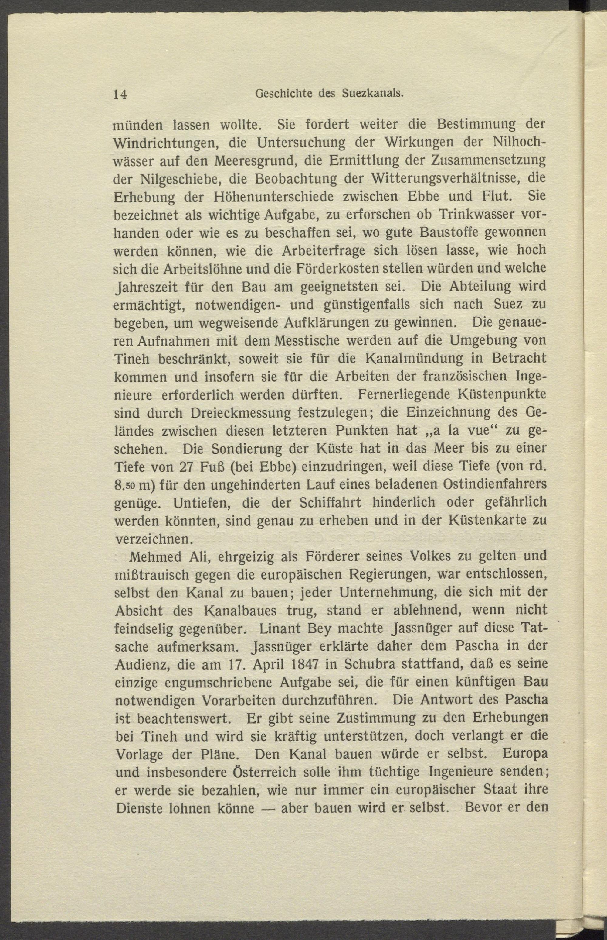 münden lassen wollte. Sie fordert weiter die Bestimmung der Windrichtungen, die Untersuchung der Wirkungen der Nilhochwässer auf den Meeresgrund, die Ermittlung der Zusammensetzung der Nilgeschiebe, die Beobachtung der Witterungsverhältnisse, die Erhebung der Höhenunterschiede zwischen Ebbe und Flut. Sie bezeichnet als wichtige Aufgabe, zu erforschen ob Trinkwasser vorhanden oder wie es zu beschaffen sei, wo gute Baustoffe gewonnen werden können, wie die Arbeiterfrage sich lösen lasse, wie hoch sich die Arbeitslöhne und die Förderkosten stellen würden und welche Jahreszeit für den Bau am geeignetsten sei. Die Abteilung wird ermächtigt, notwendigen- und günstigenfalls sich nach Suez zu begeben, um wegweisende Aufklärungen zu gewinnen. Die genaueren Aufnahmen mit dem Messtische werden auf die Umgebung von Tineh beschränkt, soweit sie für die Kanal mündung in Betracht kommen und insofern sie für die Arbeiten der französischen Ingenieure erforderlich werden dürften. Fernerliegende Küstenpunkte sind durch Dreieckmessung festzulegen; die Einzeichnung des Geländes zwischen diesen letzteren Punkten hat ,,a la vue“ zu geschehen. Die Sondierung der Küste hat in das Meer bis zu einer Tiefe von 27 Fuß (bei Ebbe) einzudringen, weil diese Tiefe (von rd. 8.50 m) für den ungehinderten Lauf eines beladenen Ostindienfahrers genüge. Untiefen, die der Schiffahrt hinderlich oder gefährlich werden könnten, sind genau zu erheben und in der Küstenkarte zu verzeichnen.