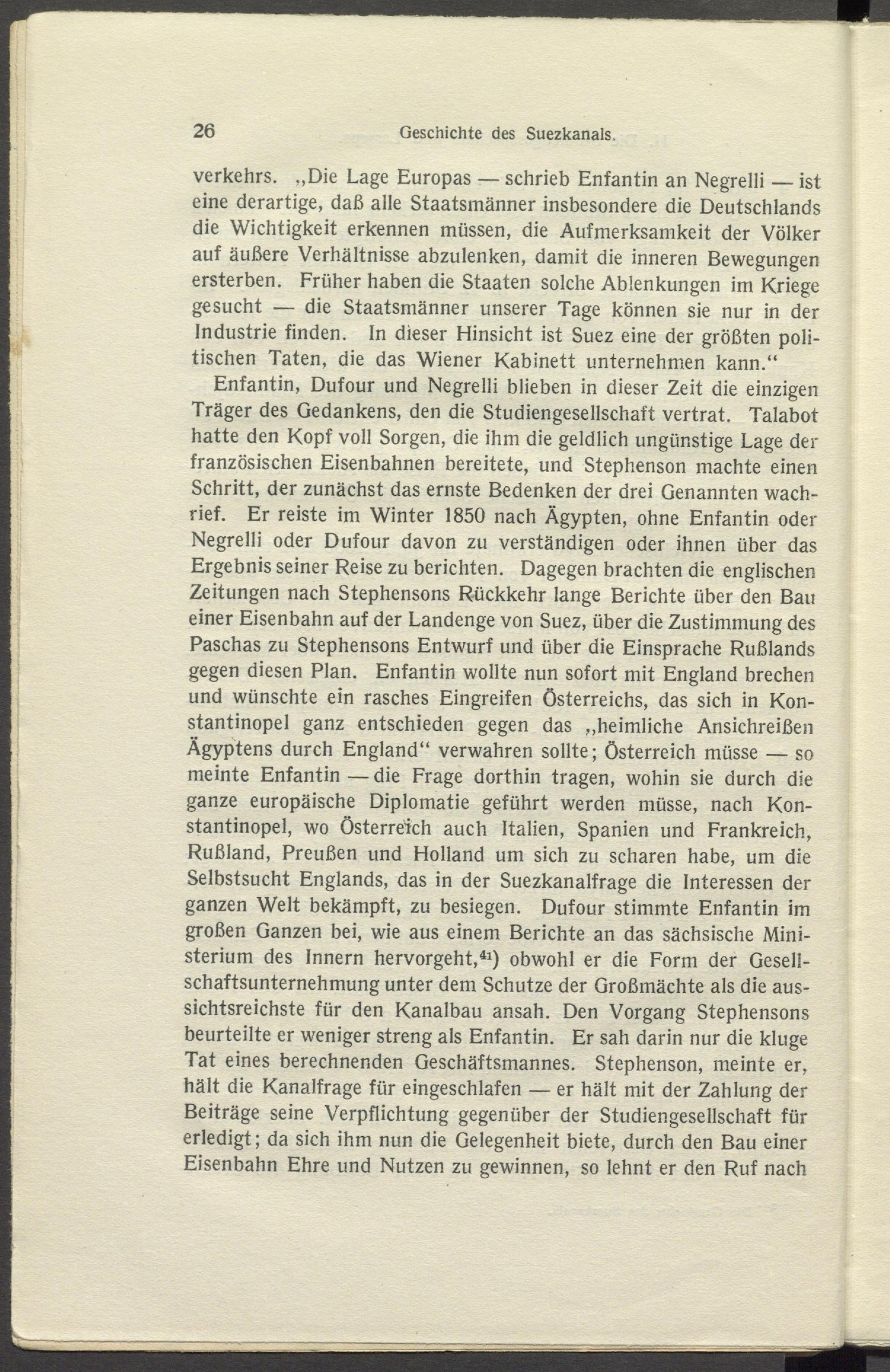 Verkehrs. „Die Lage Europas — schrieb Enfantin an Negrelli — ist eine derartige, daß alle Staatsmänner insbesondere die Deutschlands die Wichtigkeit erkennen müssen, die Aufmerksamkeit der Völker auf äußere Verhältnisse abzulenken, damit die inneren Bewegungen ersterben. Früher haben die Staaten solche Ablenkungen im Kriege gesucht — die Staatsmänner unserer Tage können sie nur in der Industrie finden. In dieser Hinsicht ist Suez eine der größten politischen Taten, die das Wiener Kabinett unternehmen kann.“ Enfantin, Dufour und Negrelli blieben in dieser Zeit die einzigen Träger des Gedankens, den die Studiengesellschaft vertrat. Talabot hatte den Kopf voll Sorgen, die ihm die geldlich ungünstige Lage der französischen Eisenbahnen bereitete, und Stephenson machte einen Schritt, der zunächst das ernste Bedenken der drei Genannten wachrief. Er reiste im Winter 1850 nach Ägypten, ohne Enfantin oder Negrelli oder Dufour davon zu verständigen oder ihnen über das Ergebnis seiner Reise zu berichten. Dagegen brachten die englischen Zeitungen nach Stephensons Rückkehr lange Berichte über den Bau einer Eisenbahn auf der Landenge von Suez, über die Zustimmung des Paschas zu Stephensons Entwurf und über die Einsprache Rußlands gegen diesen Plan. Enfantin wollte nun sofort mit England brechen und wünschte ein rasches Eingreifen Österreichs, das sich in Konstantinopel ganz entschieden gegen das „heimliche Ansichreißen Ägyptens durch England“ verwahren sollte; Österreich müsse — so meinte Enfantin — die Frage dorthin tragen, wohin sie durch die ganze europäische Diplomatie geführt werden müsse, nach Konstantinopel, wo Österreich auch Italien, Spanien und Frankreich, Rußland, Preußen und Holland um sich zu scharen habe, um die Selbstsucht Englands, das in der Suezkanalfrage die Interessen der ganzen Welt bekämpft, zu besiegen. Dufour stimmte Enfantin im großen Ganzen bei, wie aus einem Berichte an das sächsische Ministerium des Innern hervorgeht, 41 ) obwohl er die Form der Gesellschaftsunternehmung unter dem Schutze der Großmächte als die aussichtsreichste für den Kanalbau ansah. Den Vorgang Stephensons beurteilte er weniger streng als Enfantin. Er sah darin nur die kluge Tat eines berechnenden Geschäftsmannes. Stephenson, meinte er, hält die Kanalfrage für eingeschlafen — er hält mit der Zahlung der Beiträge seine Verpflichtung gegenüber der Studiengesellschaft für erledigt; da sich ihm nun die Gelegenheit biete, durch den Bau einer Eisenbahn Ehre und Nutzen zu gewinnen, so lehnt er den Ruf nach