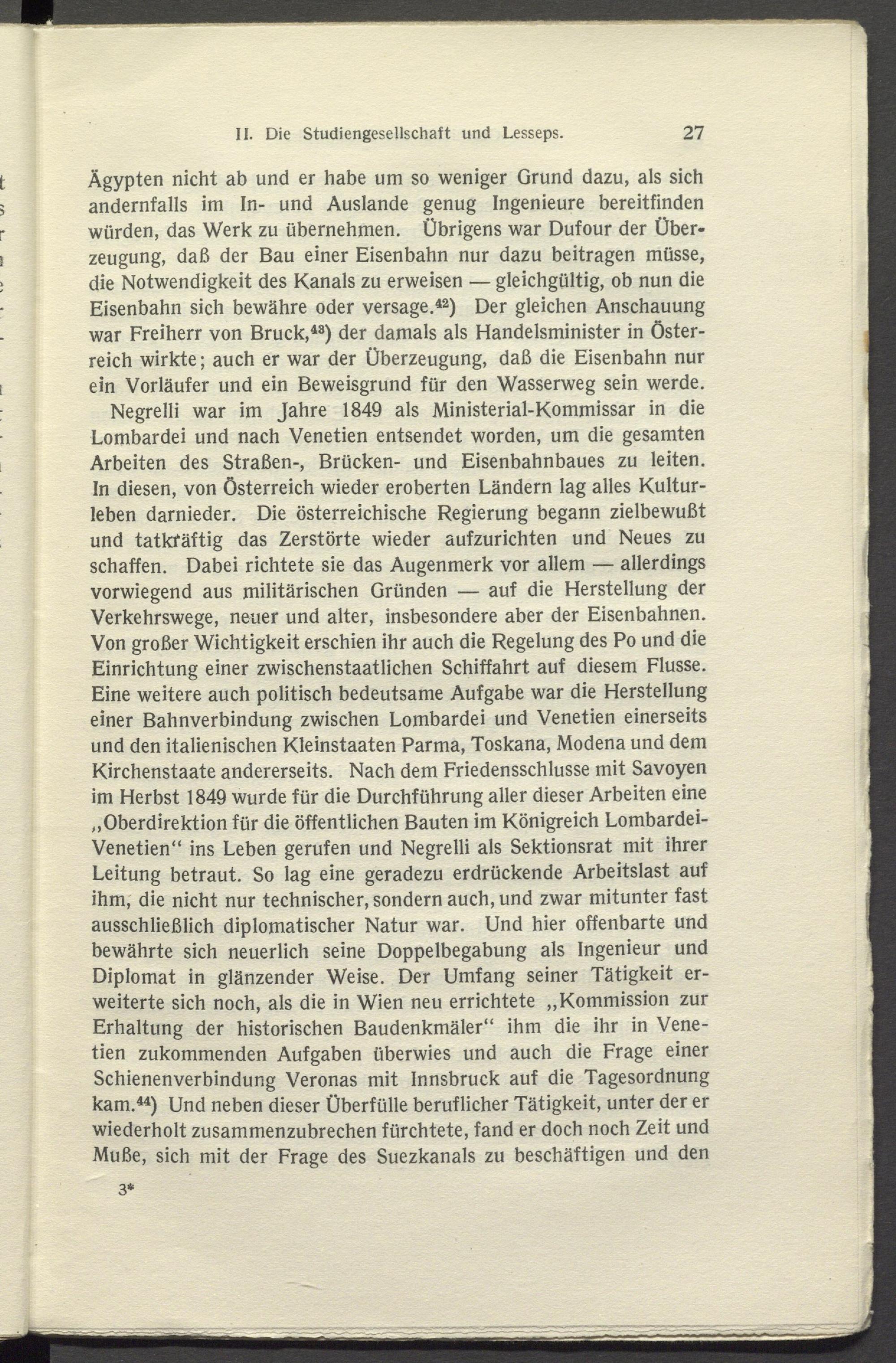 Negrelli war im Jahre 1849 als Ministerial-Kommissar in die Lombardei und nach Venetien entsendet worden, um die gesamten Arbeiten des Straßen-, Brücken- und Eisenbahnbaues zu leiten. In diesen, von Österreich wieder eroberten Ländern lag alles Kulturleben darnieder. Die österreichische Regierung begann zielbewußt und tatkräftig das Zerstörte wieder aufzurichten und Neues zu schaffen. Dabei richtete sie das Augenmerk vor allem — allerdings vorwiegend aus militärischen Gründen — auf die Herstellung der Verkehrswege, neuer und alter, insbesondere aber der Eisenbahnen. Von großer Wichtigkeit erschien ihr auch die Regelung des Po und die Einrichtung einer zwischenstaatlichen Schiffahrt auf diesem Flusse. Eine weitere auch politisch bedeutsame Aufgabe war die Herstellung einer Bahnverbindung zwischen Lombardei und Venetien einerseits und den italienischen Kleinstaaten Parma, Toskana, Modena und dem Kirchenstaate andererseits. Nach dem Friedensschlüsse mit Savoyen im Herbst 1849 wurde für die Durchführung aller dieser Arbeiten eine „Oberdirektion für die öffentlichen Bauten im Königreich Lombardei- Venetien“ ins Leben gerufen und Negrelli als Sektionsrat mit ihrer Leitung betraut. So lag eine geradezu erdrückende Arbeitslast auf ihm, die nicht nur technischer, sondern auch, und zwar mitunter fast ausschließlich diplomatischer Natur war. Und hier offenbarte und bewährte sich neuerlich seine Doppelbegabung als Ingenieur und Diplomat in glänzender Weise. Der Umfang seiner Tätigkeit erweiterte sich noch, als die in Wien neu errichtete „Kommission zur Erhaltung der historischen Baudenkmäler“ ihm die ihr in Venetien zukommenden Aufgaben überwies und auch die Frage einer Schienenverbindung Veronas mit Innsbruck auf die Tagesordnung kam. 44 ) Und neben dieser Überfülle beruflicher Tätigkeit, unter der er wiederholt zusammenzubrechen fürchtete, fand er doch noch Zeit und Muße, sich mit der Frage des Suezkanals zu beschäftigen und den