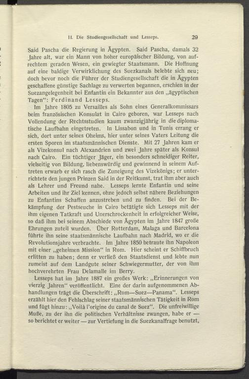 Im Jahre 1805 zu Versailles als Sohn eines Generalkommissars beim französischen Konsulat in Cairo geboren, war Lesseps nach Vollendung der Rechtsstudien kaum zwanzigjährig in die diplomatische Laufbahn eingetreten. In Lissabon und in Tunis errang er sich, dort unter seines Oheims, hier unter seines Vaters Leitung die ersten Sporen im staatsmännischen Dienste. Mit 27 Jahren kam er als Vizekonsul nach Alexandrien und zwei Jahre später als Konsul nach Cairo. Ein tüchtiger Jäger, ein besonders schneidiger Reiter, vielseitig von Bildung, liebenswürdig und gewinnend in seinem Auftreten erwarb er sich rasch die Zuneigung des Vizekönigs; er unterrichtete den jungen Prinzen Said in der Reitkunst, trat ihm aber auch als Lehrer und Freund nahe. Lesseps lernte Enfantin und seine Arbeiten und ihr Ziel kennen, ohne jedoch selbst nähere Beziehungen zu Enfantins Schaffen anzustreben und zu finden. Bei der Bekämpfung der Pestseuche in Cairo betätigte sich Lesseps mit der ihm eigenen Tatkraft und Unerschrockenheit in erfolgreicher Weise, so daß ihm bei seinem Abschiede von Ägypten im Jahre 1847 große Ehrungen zuteil wurden. Über Rotterdam, Malaga und Barcelona führte ihn seine staatsmännische Laufbahn nach Madrid, wo er die Revolutionsjahre verbrachte. Im Jahre 1850 betraute ihn Napoleon mit einer „geheimen Mission“ in Rom. Hier scheint er Schiffbruch erlitten zu haben; denn er verließ den Staatsdienst und lebte nun zumeist auf dem Landgute seiner Schwiegermutter, der von ihm hochverehrten Frau Delamalle im Berry.