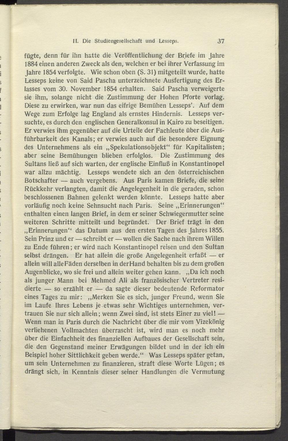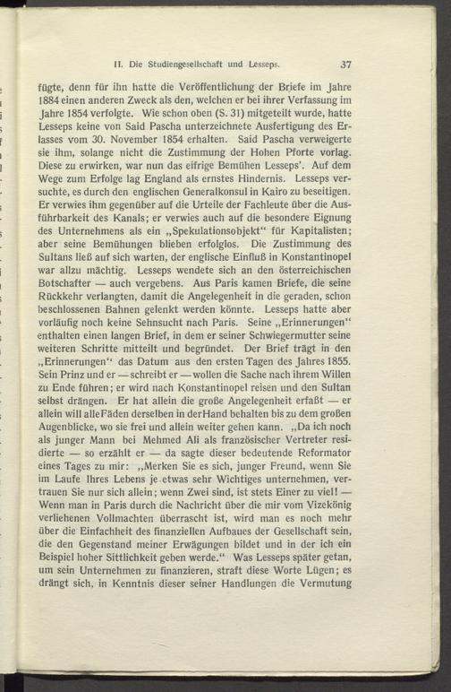 fügte, denn für ihn hatte die Veröffentlichung der Briefe im Jahre 1884 einen anderen Zweck als den, welchen er bei ihrer Verfassung im Jahre 1854 verfolgte. Wie schon oben (S. 31) mitgeteilt wurde, hatte Lesseps keine von Said Pascha Unterzeichnete Ausfertigung des Erlasses vom 30. November 1854 erhalten. Said Pascha verweigerte sie ihm, solange nicht die Zustimmung der Hohen Pforte vorlag. Diese zu erwirken, war nun das eifrige Bemühen Lesseps’. Auf dem Wege zum Erfolge lag England als ernstes Hindernis. Lesseps versuchte, es durch den englischen Generalkonsul in Kairo zu beseitigen. Er verwies ihm gegenüber auf die Urteile der Fachleute über die Ausführbarkeit des Kanals; er verwies auch auf die besondere Eignung des Unternehmens als ein „Spekulationsobjekt“ für Kapitalisten; aber seine Bemühungen blieben erfolglos. Die Zustimmung des Sultans ließ auf sich warten, der englische Einfluß in Konstantinopel war allzu mächtig. Lesseps wendete sich an den österreichischen Botschafter — auch vergebens. Aus Paris kamen Briefe, die seine Rückkehr verlangten, damit die Angelegenheit in die geraden, schon beschlossenen Bahnen gelenkt werden könnte. Lesseps hatte aber vorläufig noch keine Sehnsucht nach Paris. Seine „Erinnerungen“ enthalten einen langen Brief, in dem er seiner Schwiegermutter seine weiteren Schritte mitteilt und begründet. Der Brief trägt in den „Erinnerungen“ das Datum aus den ersten Tagen des Jahres 1855. Sein Prinz und er — schreibt er — wollen die Sache nach ihrem Willen zu Ende führen; er wird nach Konstantinopel reisen und den Sultan selbst drängen. Er hat allein die große Angelegenheit erfaßt — er allein will alle Fäden derselben in derHand behalten bis zu dem großen Augenblicke, wo sie frei und allein weiter gehen kann. „Da ich noch als junger Mann bei Mehmed Ali als französischer Vertreter residierte — so erzählt er — da sagte dieser bedeutende Reformator eines Tages zu mir: „Merken Sie es sich, junger Freund, wenn Sie im Laufe Ihres Lebens je etwas sehr Wichtiges unternehmen, vertrauen Sie nur sich allein; wenn Zwei sind, ist stets Einer zu viel! — Wenn man in Paris durch die Nachricht über die mir vom Vizekönig verliehenen Vollmachten überrascht ist, wird man es noch mehr über die Einfachheit des finanziellen Aufbaues der Gesellschaft sein, die den Gegenstand meiner Erwägungen bildet und in der ich ein Beispiel hoher Sittlichkeit geben werde.“ Was Lesseps später getan, um sein Unternehmen zu finanzieren, straft diese Worte Lügen; es drängt sich, in Kenntnis dieser seiner Handlungen die Vermutung