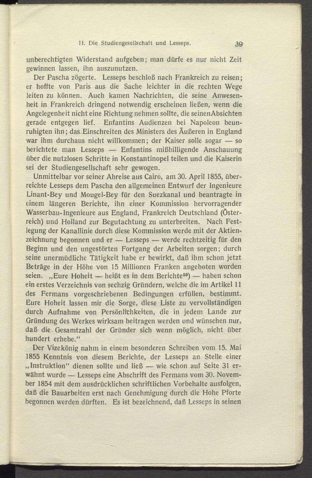 Der Vizekönig nahm in einem besonderen Schreiben vom 15. Mai 1855 Kenntnis von diesem Berichte, der Lesseps an Stelle einer „Instruktion“ dienen sollte und ließ — wie schon auf Seite 31 erwähnt wurde — Lesseps eine Abschrift des Fermans vom 30. November 1854 mit dem ausdrücklichen schriftlichen Vorbehalte ausfolgen, daß die Bauarbeiten erst nach Genehmigung durch die Hohe Pforte begonnen werden dürften. Es ist bezeichnend, daß Lesseps in seinen