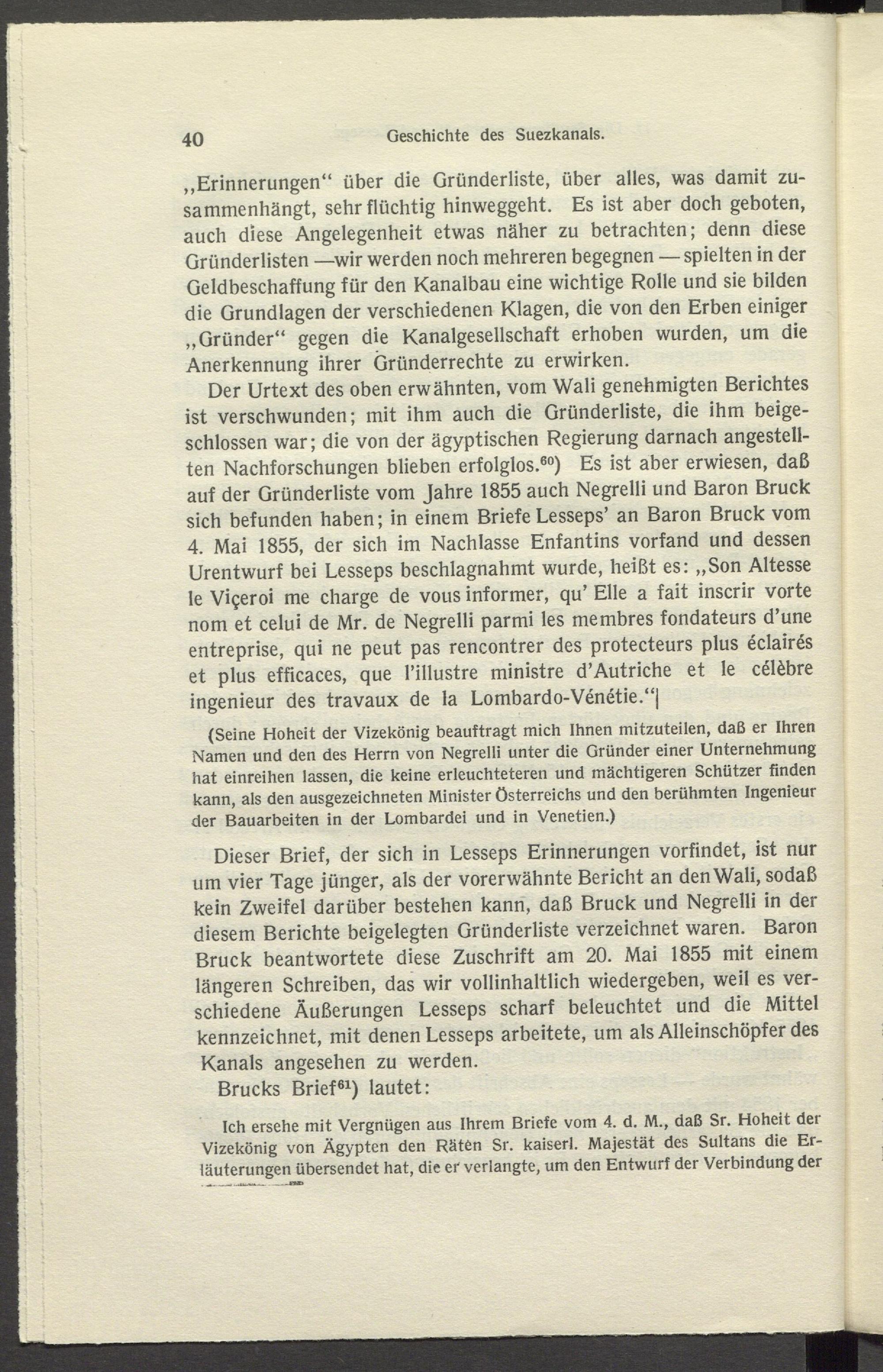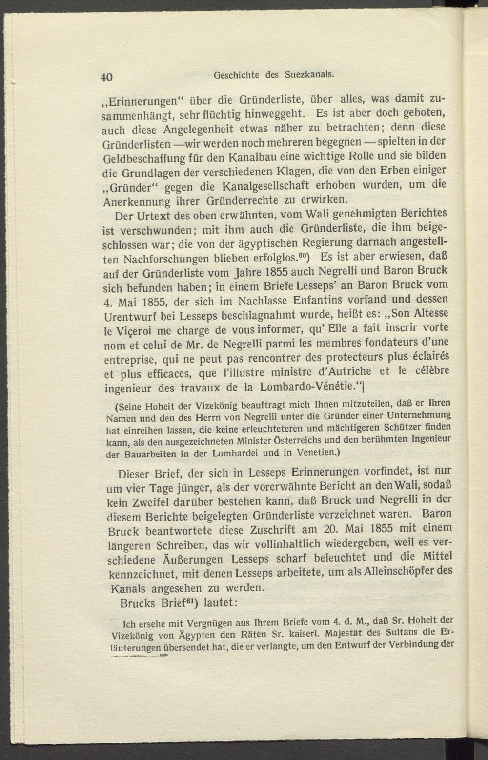 Dieser Brief, der sich in Lesseps Erinnerungen vorfindet, ist nur um vier Tage jünger, als der vorerwähnte Bericht an den Wali, sodaß kein Zweifel darüber bestehen kann, daß Bruck und Negrelli in der diesem Berichte beigelegten Gründerliste verzeichnet waren. Baron Bruck beantwortete diese Zuschrift am 20. Mai 1855 mit einem längeren Schreiben, das wir vollinhaltlich wiedergeben, weil es verschiedene Äußerungen Lesseps scharf beleuchtet und die Mittel kennzeichnet, mit denen Lesseps arbeitete, um als Alleinschöpfer des Kanals angesehen zu werden.