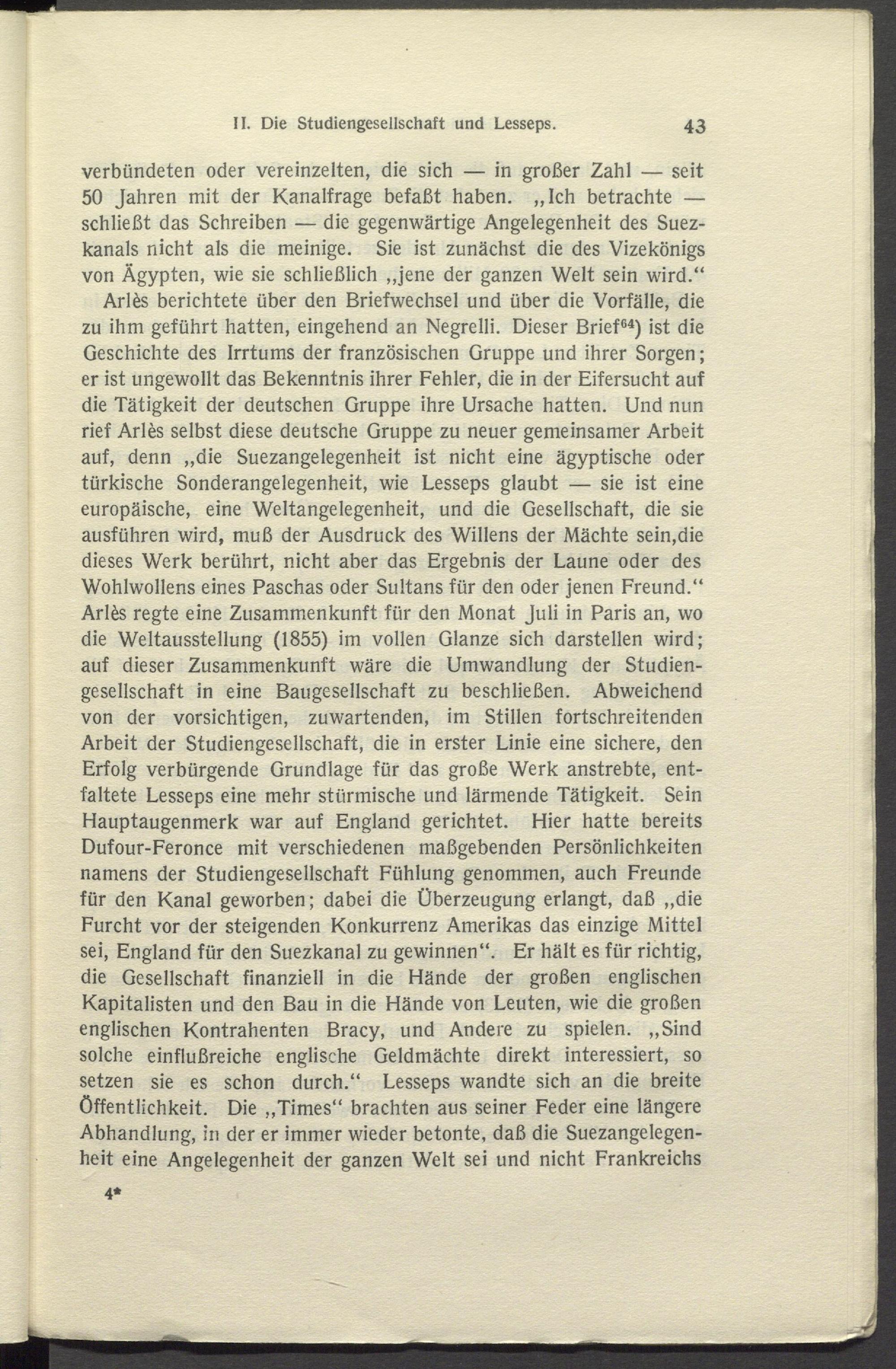 verbündeten oder vereinzelten, die sich — in großer Zahl — seit 50 Jahren mit der Kanalfrage befaßt haben. „Ich betrachte — schließt das Schreiben — die gegenwärtige Angelegenheit des Suezkanals nicht als die meinige. Sie ist zunächst die des Vizekönigs von Ägypten, wie sie schließlich „jene der ganzen Welt sein wird.“ Arl£s berichtete über den Briefwechsel und über die Vorfälle, die zu ihm geführt hatten, eingehend an Negrelli. Dieser Brief 64 ) ist die Geschichte des Irrtums der französischen Gruppe und ihrer Sorgen; er ist ungewollt das Bekenntnis ihrer Fehler, die in der Eifersucht auf die Tätigkeit der deutschen Gruppe ihre Ursache hatten. Und nun rief Arles selbst diese deutsche Gruppe zu neuer gemeinsamer Arbeit auf, denn „die Suezangelegenheit ist nicht eine ägyptische oder türkische Sonderangelegenheit, wie Lesseps glaubt — sie ist eine europäische, eine Weltangelegenheit, und die Gesellschaft, die sie ausführen wird, muß der Ausdruck des Willens der Mächte sein,die dieses Werk berührt, nicht aber das Ergebnis der Laune oder des Wohlwollens eines Paschas oder Sultans für den oder jenen Freund.“ Arl£s regte eine Zusammenkunft für den Monat Juli in Paris an, wo die Weltausstellung (1855) im vollen Glanze sich darstellen wird; auf dieser Zusammenkunft wäre die Umwandlung der Studiengesellschaft in eine Baugesellschaft zu beschließen. Abweichend von der vorsichtigen, zuwartenden, im Stillen fortschreitenden Arbeit der Studiengesellschaft, die in erster Linie eine sichere, den Erfolg verbürgende Grundlage für das große Werk anstrebte, entfaltete Lesseps eine mehr stürmische und lärmende Tätigkeit. Sein Hauptaugenmerk war auf England gerichtet. Hier hatte bereits Dufour-Feronce mit verschiedenen maßgebenden Persönlichkeiten namens der Studiengesellschaft Fühlung genommen, auch Freunde für den Kanal geworben; dabei die Überzeugung erlangt, daß „die Furcht vor der steigenden Konkurrenz Amerikas das einzige Mittel sei, England für den Suezkanal zu gewinnen“. Er hält es für richtig, die Gesellschaft finanziell in die Hände der großen englischen Kapitalisten und den Bau in die Hände von Leuten, wie die großen englischen Kontrahenten Bracy, und Andere zu spielen. „Sind solche einflußreiche englische Geldmächte direkt interessiert, so setzen sie es schon durch.“ Lesseps wandte sich an die breite Öffentlichkeit. Die „Times“ brachten aus seiner Feder eine längere Abhandlung, in der er immer wieder betonte, daß die Suezangelegenheit eine Angelegenheit der ganzen Welt sei und nicht Frankreichs