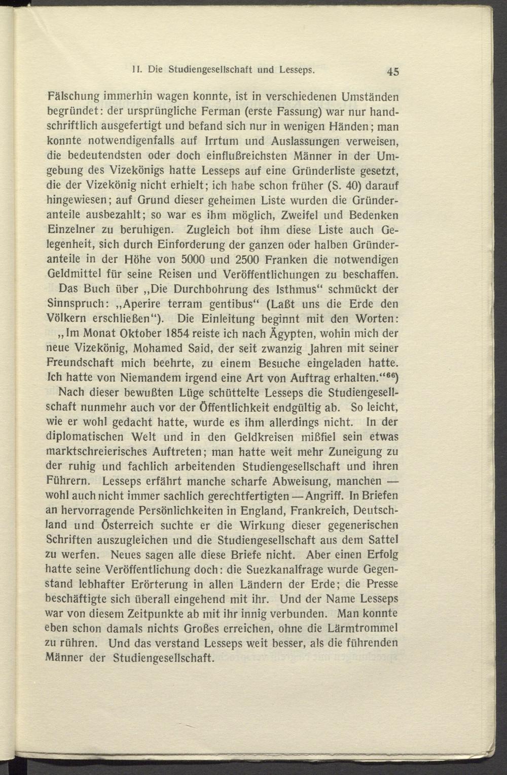 Fälschung immerhin wagen konnte, ist in verschiedenen Umständen begründet: der ursprüngliche Ferman (erste Fassung) war nur handschriftlich ausgefertigt und befand sich nur in wenigen Händen; man konnte notwendigenfalls auf Irrtum und Auslassungen verweisen, die bedeutendsten oder doch einflußreichsten Männer in der Umgebung des Vizekönigs hatte Lesseps auf eine Gründerliste gesetzt, die der Vizekönig nicht erhielt; ich habe schon früher (S. 40) darauf hingewiesen; auf Grund dieser geheimen Liste wurden die Gründeranteile ausbezahlt; so war es ihm möglich, Zweifel und Bedenken Einzelner zu beruhigen. Zugleich bot ihm diese Liste auch Gelegenheit, sich durch Einforderung der ganzen oder halben Gründeranteile in der Höhe von 5000 und 2500 Franken die notwendigen Geldmittel für seine Reisen und Veröffentlichungen zu beschaffen.
