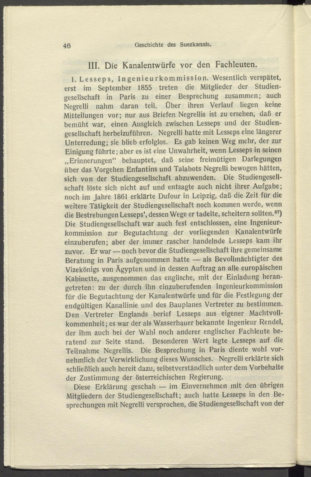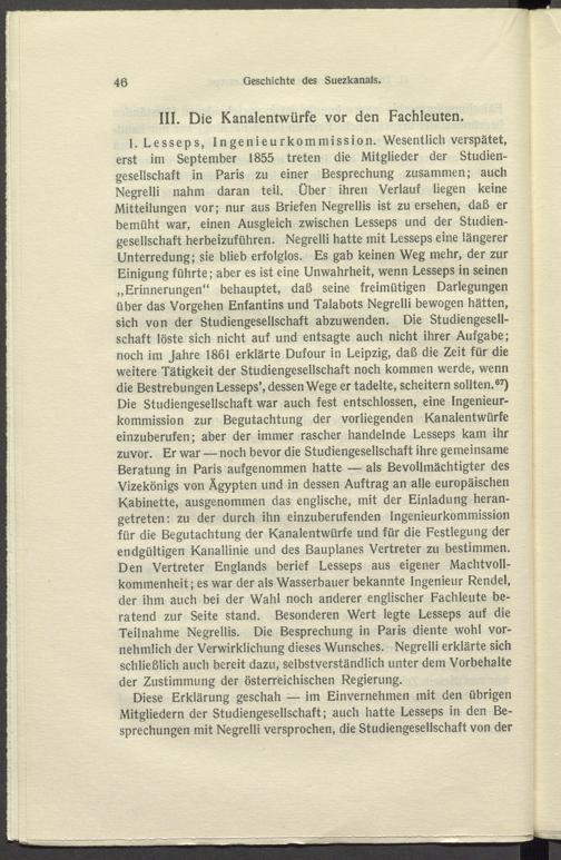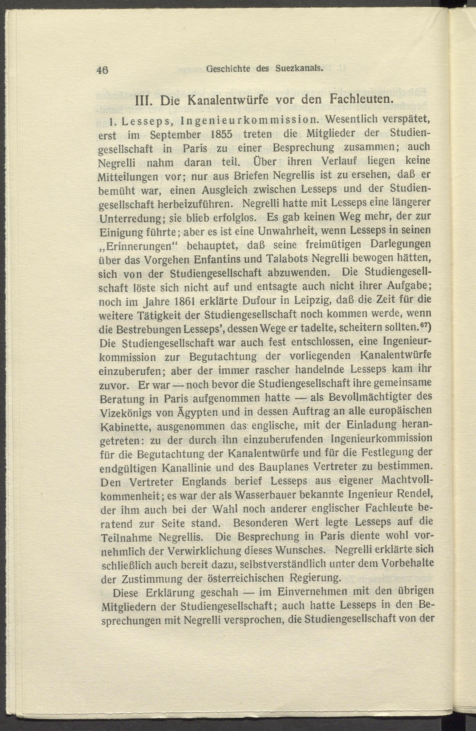 1. Lesseps, Ingenieurkommission. Wesentlich verspätet, erst im September 1855 treten die Mitglieder der Studiengesellschaft in Paris zu einer Besprechung zusammen; auch Negrelli nahm daran teil. Über ihren Verlauf liegen keine Mitteilungen vor; nur aus Briefen Negrellis ist zu ersehen, daß er bemüht war, einen Ausgleich zwischen Lesseps und der Studiengesellschaft herbeizuführen. Negrelli hatte mit Lesseps eine längerer Unterredung; sie blieb erfolglos. Es gab keinen Weg mehr, der zur Einigung führte; aber es ist eine Unwahrheit, wenn Lesseps in seinen „Erinnerungen“ behauptet, daß seine freimütigen Darlegungen über das Vorgehen Enfantins und Talabots Negrelli bewogen hätten, sich von der Studiengesellschaft abzuwenden. Die Studiengesellschaft löste sich nicht auf und entsagte auch nicht ihrer Aufgabe; noch im Jahre 1861 erklärte Dufour in Leipzig, daß die Zeit für die weitere Tätigkeit der Studiengesellschaft noch kommen werde, wenn die Bestrebungen Lesseps’, dessen Wege er tadelte, scheitern sollten. 67 ) Die Studiengesellschaft war auch fest entschlossen, eine Ingenieurkommission zur Begutachtung der vorliegenden Kanalentwürfe einzuberufen; aber der immer rascher handelnde Lesseps kam ihr zuvor. Er war — noch bevor die Studiengesellschaft ihre gemeinsame Beratung in Paris aufgenommen hatte — als Bevollmächtigter des Vizekönigs von Ägypten und in dessen Auftrag an alle europäischen Kabinette, ausgenommen das englische, mit der Einladung herangetreten: zu der durch ihn einzuberufenden Ingenieurkommission für die Begutachtung der Kanalentwürfe und für die Festlegung der endgültigen Kanallinie und des Bauplanes Vertreter zu bestimmen. Den Vertreter Englands berief Lesseps aus eigener Machtvollkommenheit; es war der als Wasserbauer bekannte Ingenieur Rendel, der ihm auch bei der Wahl noch anderer englischer Fachleute beratend zur Seite stand. Besonderen Wert legte Lesseps auf die Teilnahme Negrellis. Die Besprechung in Paris diente wohl vornehmlich der Verwirklichung dieses Wunsches. Negrelli erklärte sich schließlich auch bereit dazu, selbstverständlich unter dem Vorbehalte der Zustimmung der österreichischen Regierung.