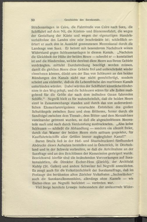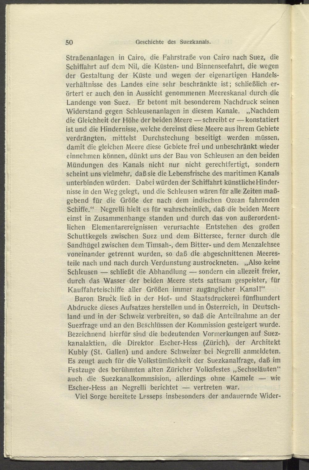 Straßenanlagen in Cairo, die Fahrstraße von Cairo nach Suez, die Schiffahrt auf dem Nil, die Küsten- und Binnenseefahrt, die wegen der Gestaltung der Küste und wegen der eigenartigen Handelsverhältnisse des Landes eine sehr beschränkte ist; schließlich erörtert er auch den in Aussicht genommenen Meereskanal durch die Landenge von Suez. Er betont mit besonderem Nachdruck seinen Widerstand gegen Schleusenanlagen in diesem Kanäle. „Nachdem die Gleichheit der Höhe der beiden Meere — schreibt er — konstatiert ist und die Hindernisse, welche dereinst diese Meere aus ihrem Gebiete verdrängten, mittelst Durchstechung beseitigt werden müssen, damit die gleichen Meere diese Gebiete frei und unbeschränkt wieder einnehmen können, dünkt uns der Bau von Schleusen an den beiden Mündungen des Kanals nicht nur nicht gerechtfertigt, sondern scheint uns vielmehr, daß sie die Lebensfrische des maritimen Kanals unterbinden würden. Dabei würden der Schiffahrt künstliche Hindernisse in den Weg gelegt, und die Schleusen wären für alle Zeiten maßgebend für die Größe der nach dem indischen Ozean fahrenden Schiffe.“ Negrelli hielt es für wahrscheinlich, daß die beiden Meere einst in Zusammenhänge standen und durch das von außerordentlichen Elementarereignissen verursachte Entstehen des großen Schuttkegels zwischen Suez und dem Bittersee, ferner durch die Sandhügel zwischen dem Timsah-, dem Bitter- und dem Menzalehsee voneinander getrennt wurden, so daß die abgeschnittenen Meeresteile nach und nach durch Verdunstung austrockneten. „Also keine Schleusen — schließt die Abhandlung — sondern ein allezeit freier, durch das Wasser der beiden Meere stets sattsam gespeister, für Kauffahrteischiffe aller Größen immer zugänglicher Kanal!“