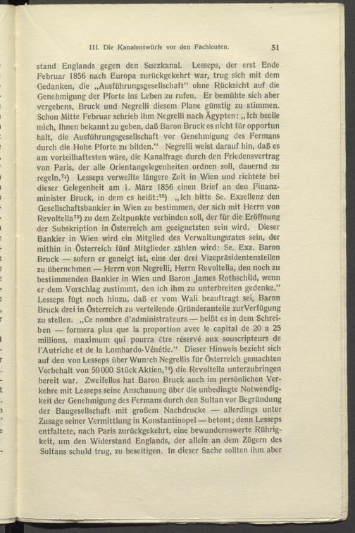 stand Englands gegen den Suezkanal. Lesseps, der erst Ende Februar 1856 nach Europa zurückgekehrt war, trug sich mit dem Gedanken, die „Ausführungsgesellschaft“ ohne Rücksicht auf die Genehmigung der Pforte ins Leben zu rufen. Er bemühte sich aber vergebens, Bruck und Negrelli diesem Plane günstig zu stimmen. Schon Mitte Februar schrieb ihm Negrelli nach Ägypten : „ Ich beeile mich, Ihnen bekannt zu geben, daß Baron Bruck es nicht für opportun hält, die Ausführungsgesellschaft vor Genehmigung des Fermans durch die Hohe Pforte zu bilden.“ Negrelli weist darauf hin, daß es am vorteilhaftesten wäre, die Kanalfrage durch den Friedensvertrag von Paris, der alle Orientangelegenheiten ordnen soll, dauernd zu regeln. 71 ) Lesseps verweilte längere Zeit in Wien und richtete bei dieser Gelegenheit am 1. März 1856 einen Brief an den Finanzminister Bruck, in dem es heißt: 72 ) „Ich bitte Se. Exzellenz den Gesellschaftsbankier in Wien zu bestimmen, der sich mit Herrn von Revoltella 78 ) zu dem Zeitpunkte verbinden soll, der für die Eröffnung der Subskription in Österreich am geeignetsten sein wird. Dieser Bankier in Wien wird ein Mitglied des Verwaltungsrates sein, der mithin in Österreich fünf Mitglieder zählen wird: Se. Exz. Baron Bruck — sofern er geneigt ist, eine der drei Vizepräsidentenstellen zu übernehmen — Herrn von Negrelli, Herrn Revoltella, den noch zu bestimmenden Bankier in Wien und Baron James Rothschild, wenn er dem Vorschlag zustimmt, den ich ihm zu unterbreiten gedenke.“ Lesseps fügt noch hinzu, daß er vom Wali beauftragt sei, Baron Bruck drei in Österreich zu verteilende Gründeranteile zurVerfügung zu stellen. „Ce nombre d’administrateurs — heißt es in dem Schreiben — formera plus que la proportion avec le capital de 20 a 25 millions, maximum qui pourra être réservé aux souscripteurs de l’Autriche et de la Lombardo-Vénétie.“ Dieser Hinweis bezieht sich auf den von Lesseps über Wunsch Negrellis für Österreich gemachten Vorbehalt von 50000 Stück Aktien, 74 ) die Revoltella unterzubringen bereit war. Zweifellos hat Baron Bruck auch im persönlichen Verkehre mit Lesseps seine Anschauung über die unbedingte Notwendigkeit der Genehmigung des Fermans durch den Sultan vor Begründung der Baugesellschaft mit großem Nachdrucke — allerdings unter Zusage seiner Vermittlung in Konstantinopel — betont; denn Lesseps entfaltete, nach Paris zurückgekehrt, eine bewundernswerte Rührigkeit, um den Widerstand Englands, der allein an dem Zögern des Sultans schuld trug, zu beseitigen. In dieser Sache sollten ihm aber