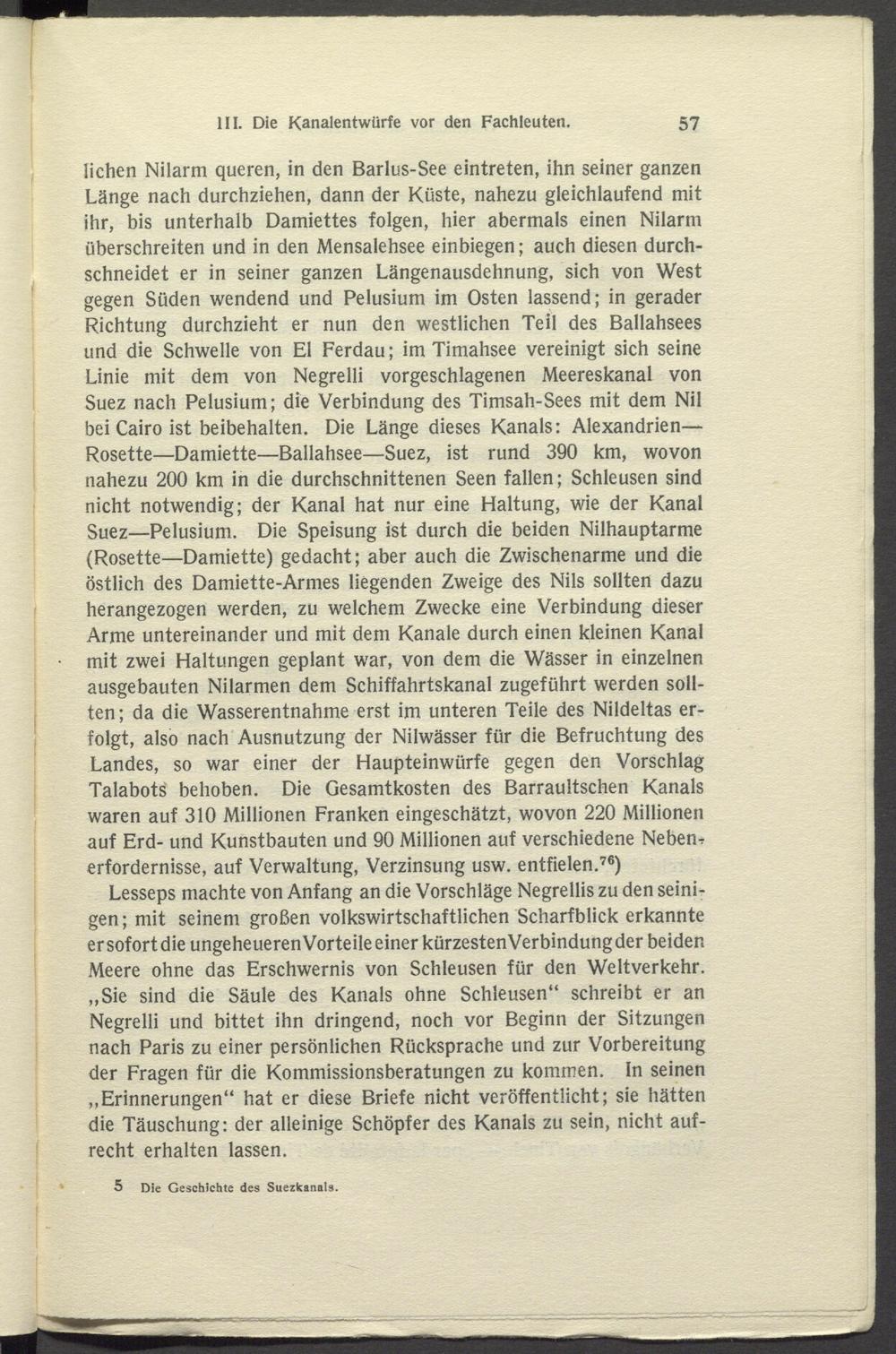 liehen Nilarm queren, in den Barlus-See eintreten, ihn seiner ganzen Länge nach durchziehen, dann der Küste, nahezu gleichlaufend mit ihr, bis unterhalb Damiettes folgen, hier abermals einen Nilarm überschreiten und in den Mensalehsee einbiegen; auch diesen durchschneidet er in seiner ganzen Längenausdehnung, sich von West gegen Süden wendend und Pelusium im Osten lassend; in gerader Richtung durchzieht er nun den westlichen Teil des Ballahsees und die Schwelle von El Ferdau; im Timahsee vereinigt sich seine Linie mit dem von Negrelli vorgeschlagenen Meereskanal von Suez nach Pelusium; die Verbindung des Timsah-Sees mit dem Nil bei Cairo ist beibehalten. Die Länge dieses Kanals: Alexandrien— Rosette—Damiette—Ballahsee—Suez, ist rund 390 km, wovon nahezu 200 km in die durchschnittenen Seen fallen; Schleusen sind nicht notwendig; der Kanal hat nur eine Haltung, wie der Kanal Suez—Pelusium. Die Speisung ist durch die beiden Nilhauptarme (Rosette—Damiette) gedacht; aber auch die Zwischenarme und die östlich des Damiette-Armes liegenden Zweige des Nils sollten dazu herangezogen werden, zu welchem Zwecke eine Verbindung dieser Arme untereinander und mit dem Kanäle durch einen kleinen Kanal mit zwei Haltungen geplant war, von dem die Wässer in einzelnen ausgebauten Nilarmen dem Schiffahrtskanal zugeführt werden sollten; da die Wasserentnahme erst im unteren Teile des Nildeltas erfolgt, also nach Ausnutzung der Nilwässer für die Befruchtung des Landes, so war einer der Haupteinwürfe gegen den Vorschlag Talabots behoben. Die Gesamtkosten des Barraultschen Kanals waren auf 310 Millionen Franken eingeschätzt, wovon 220 Millionen auf Erd- und Kunstbauten und 90 Millionen auf verschiedene Neben? erfordernisse, auf Verwaltung, Verzinsung usw. entfielen. 76 )