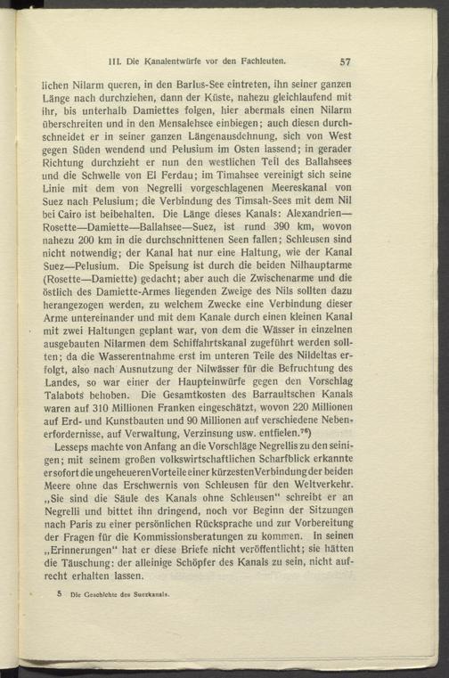 Lesseps machte von Anfang an die Vorschläge Negrellis zu den seini- gen; mit seinem großen volkswirtschaftlichen Scharfblick erkannte er sofort die ungeheueren Vorteile einer kürzestenVerbindung der beiden Meere ohne das Erschwernis von Schleusen für den Weltverkehr. „Sie sind die Säule des Kanals ohne Schleusen“ schreibt er an Negrelli und bittet ihn dringend, noch vor Beginn der Sitzungen nach Paris zu einer persönlichen Rücksprache und zur Vorbereitung der Fragen für die Kommissionsberatungen zu kommen. In seinen „Erinnerungen“ hat er diese Briefe nicht veröffentlicht; sie hätten die Täuschung: der alleinige Schöpfer des Kanals zu sein, nicht aufrecht erhalten lassen.