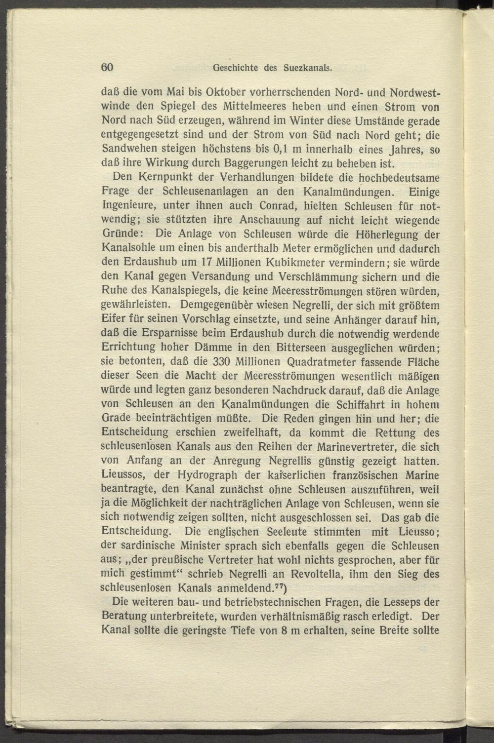 Den Kernpunkt der Verhandlungen bildete die hochbedeutsame Frage der Schleusenanlagen an den Kanalmündungen. Einige Ingenieure, unter ihnen auch Conrad, hielten Schleusen für notwendig; sie stützten ihre Anschauung auf nicht leicht wiegende Gründe: Die Anlage von Schleusen würde die Höherlegung der Kanalsohle um einen bis anderthalb Meter ermöglichen und dadurch den Erdaushub um 17 Millionen Kubikmeter vermindern; sie würde den Kanal gegen Versandung und Verschlämmung sichern und die Ruhe des Kanalspiegels, die keine Meeresströmungen stören würden, gewährleisten. Demgegenüber wiesen Negrelli, der sich mit größtem Eifer für seinen Vorschlag einsetzte, und seine Anhänger darauf hin, daß die Ersparnisse beim Erdaushub durch die notwendig werdende Errichtung hoher Dämme in den Bitterseen ausgeglichen würden; sie betonten, daß die 330 Millionen Quadratmeter fassende Fläche dieser Seen die Macht der Meeresströmungen wesentlich mäßigen würde und legten ganz besonderen Nachdruck darauf, daß die Anlage von Schleusen an den Kanalmündungen die Schiffahrt in hohem Grade beeinträchtigen müßte. Die Reden gingen Hin und her; die Entscheidung erschien zweifelhaft, da kommt die Rettung des schleusenlosen Kanals aus den Reihen der Marinevertreter, die sich von Anfang an der Anregung Negrellis günstig gezeigt hatten. Lieussos, der Hydrograph der kaiserlichen französischen Marine beantragte, den Kanal zunächst ohne Schleusen auszuführen, weil ja die Möglichkeit der nachträglichen Anlage von Schleusen, wenn sie sich notwendig zeigen sollten, nicht ausgeschlossen sei. Das gab die Entscheidung. Die englischen Seeleute stimmten mit Lieusso; der sardinische Minister sprach sich ebenfalls gegen die Schleusen aus; „der preußische Vertreter hat wohl nichts gesprochen, aber für mich gestimmt“ schrieb Negrelli an Revoltella, ihm den Sieg des schleusenlosen Kanals anmeldend. 77 )