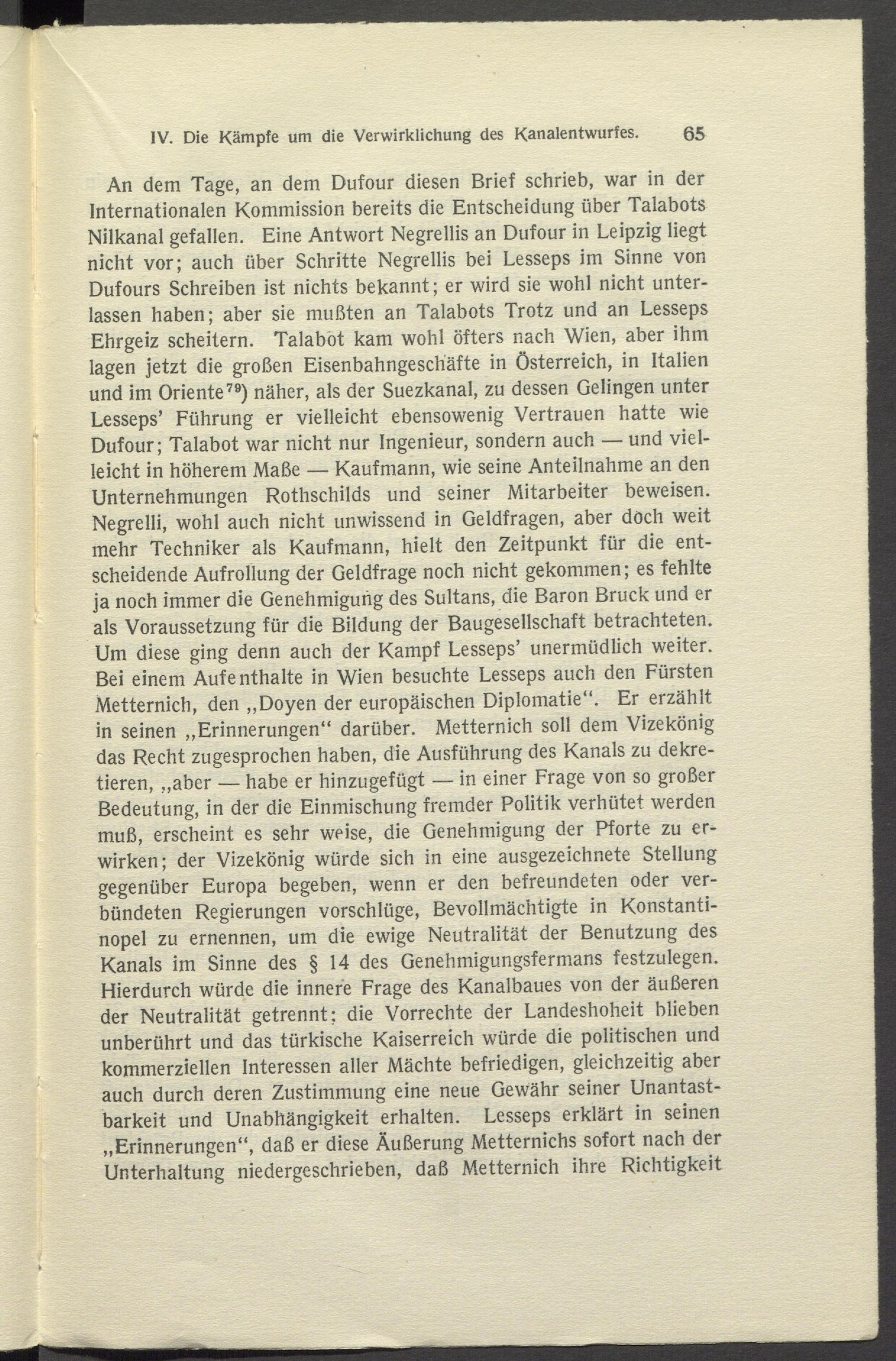 An dem Tage, an dem Dufour diesen Brief schrieb, war in der Internationalen Kommission bereits die Entscheidung über Talabots Nilkanal gefallen. Eine Antwort Negrellis an Dufour in Leipzig liegt nicht vor; auch über Schritte Negrellis bei Lesseps im Sinne von Dufours Schreiben ist nichts bekannt; er wird sie wohl nicht unterlassen haben; aber sie mußten an Talabots Trotz und an Lesseps Ehrgeiz scheitern. Talabot kam wohl öfters nach Wien, aber ihm lagen jetzt die großen Eisenbahngeschäfte in Österreich, in Italien und im Oriente 79 ) näher, als der Suezkanal, zu dessen Gelingen unter Lesseps’ Führung er vielleicht ebensowenig Vertrauen hatte wie Dufour; Talabot war nicht nur Ingenieur, sondern auch — und vielleicht in höherem Maße — Kaufmann, wie seine Anteilnahme an den Unternehmungen Rothschilds und seiner Mitarbeiter beweisen. Negrelli, wohl auch nicht unwissend in Geldfragen, aber doch weit mehr Techniker als Kaufmann, hielt den Zeitpunkt für die entscheidende Aufrollung der Geldfrage noch nicht gekommen; es fehlte ja noch immer die Genehmigung des Sultans, die Baron Bruck und er als Voraussetzung für die Bildung der Baugesellschaft betrachteten. Um diese ging denn auch der Kampf Lesseps’ unermüdlich weiter. Bei einem Aufenthalte in Wien besuchte Lesseps auch den Fürsten Metternich, den „Doyen der europäischen Diplomatie“. Er erzählt in seinen „Erinnerungen“ darüber. Metternich soll dem Vizekönig das Recht zugesprochen haben, die Ausführung des Kanals zu dekretieren, „aber — habe er hinzugefügt — in einer Frage von so großer Bedeutung, in der die Einmischung fremder Politik verhütet werden muß, erscheint es sehr weise, die Genehmigung der Pforte zu erwirken; der Vizekönig würde sich in eine ausgezeichnete Stellung gegenüber Europa begeben, wenn er den befreundeten oder verbündeten Regierungen vorschlüge, Bevollmächtigte in Konstantinopel zu ernennen, um die ewige Neutralität der Benutzung des Kanals im Sinne des § 14 des Genehmigungsfermans festzulegen. Hierdurch würde die innere Frage des Kanalbaues von der äußeren der Neutralität getrennt: die Vorrechte der Landeshoheit blieben unberührt und das türkische Kaiserreich würde die politischen und kommerziellen Interessen aller Mächte befriedigen, gleichzeitig aber auch durch deren Zustimmung eine neue Gewähr seiner Unantastbarkeit und Unabhängigkeit erhalten. Lesseps erklärt in seinen „Erinnerungen“, daß er diese Äußerung Metternichs sofort nach der Unterhaltung niedergeschrieben, daß Metternich ihre Richtigkeit