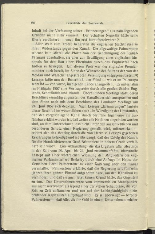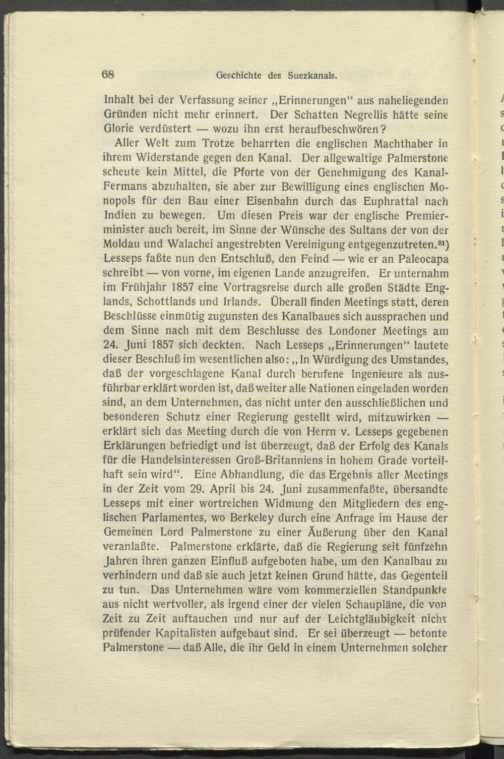 Aller Welt zum Trotze beharrten die englischen Machthaber in ihrem Widerstande gegen den Kanal. Der allgewaltige Palmerstone scheute kein Mittel, die Pforte von der Genehmigung des Kanal- Fermans abzuhalten, sie aber zur Bewilligung eines englischen Monopols für den Bau einer Eisenbahn durch das Euphrattal nach Indien zu bewegen. Um diesen Preis war der englische Premierminister auch bereit, im Sinne der Wünsche des Sultans der von der Moldau und Walachei angestrebten Vereinigung entgegenzutreten. 81 ) Lesseps faßte nun den Entschluß, den Feind — wie er an Paleocapa schreibt — von vorne, im eigenen Lande anzugreifen. Er unternahm im Frühjahr 1857 eine Vortragsreise durch alle großen Städte Englands, Schottlands und Irlands. Überall finden Meetings statt, deren Beschlüsse einmütig zugunsten des Kanalbaues sich aussprachen und dem Sinne nach mit dem Beschlüsse des Londoner Meetings am 24. Juni 1857 sich deckten. Nach Lesseps „Erinnerungen“ lautete dieser Beschluß im wesentlichen also: „ In Würdigung des Umstandes, daß der vorgeschlagene Kanal durch berufene Ingenieure als ausführbar erklärt worden ist, daß weiter alle Nationen eingeladen worden sind, an dem Unternehmen, das nicht unter den ausschließlichen und besonderen Schutz einer Regierung gestellt wird, mitzuwirken — erklärt sich das Meeting durch die von Herrn v. Lesseps gegebenen Erklärungen befriedigt und ist überzeugt, daß der Erfolg des Kanals für die Handelsinteressen Groß-Britanniens in hohem Grade vorteilhaft sein wird“. Eine Abhandlung, die das Ergebnis aller Meetings in der Zeit vom 29. April bis 24. Juni zusammenfaßte, übersandte Lesseps mit einer wortreichen Widmung den Mitgliedern des englischen Parlamentes, wo Berkeley durch eine Anfrage im Hause der Gemeinen Lord Palmerstone zu einer Äußerung über den Kanal veranlaßte. Palmerstone erklärte, daß die Regierung seit fünfzehn Jahren ihren ganzen Einfluß aufgeboten habe, um den Kanalbau zu verhindern und daß sie auch jetzt keinen Grund hätte, das Gegenteil zu tun. Das Unternehmen wäre vom kommerziellen Standpunkte aus nicht wertvoller, als irgend einer der vielen Schaupläne, die von Zeit zu Zeit auftauchen und nur auf der Leichtgläubigkeit mehr prüfender Kapitalisten aufgebaut sind. Er sei überzeugt — betonte Palmerstone — daß Alle, die ihr Geld in einem Unternehmen solcher