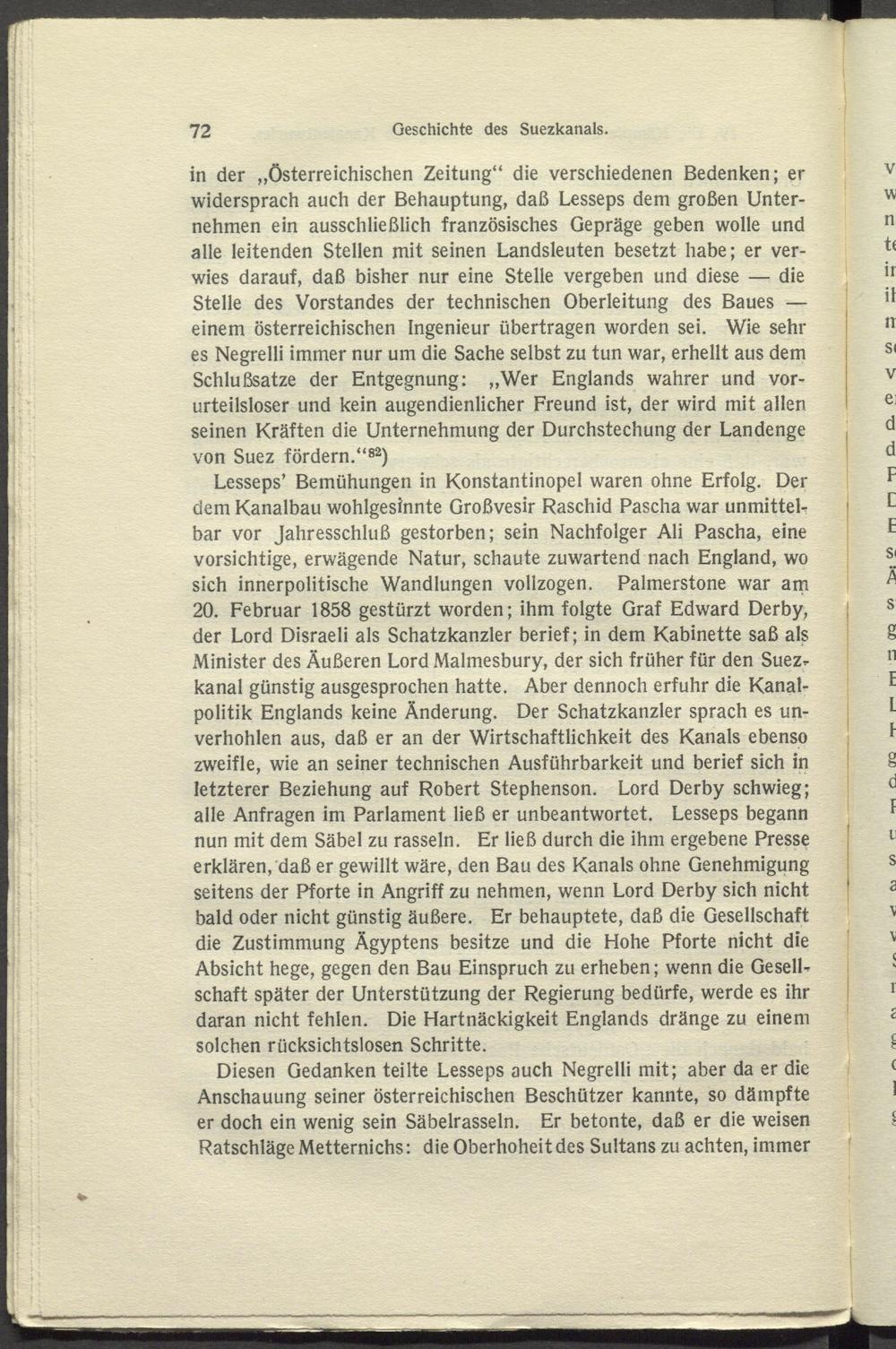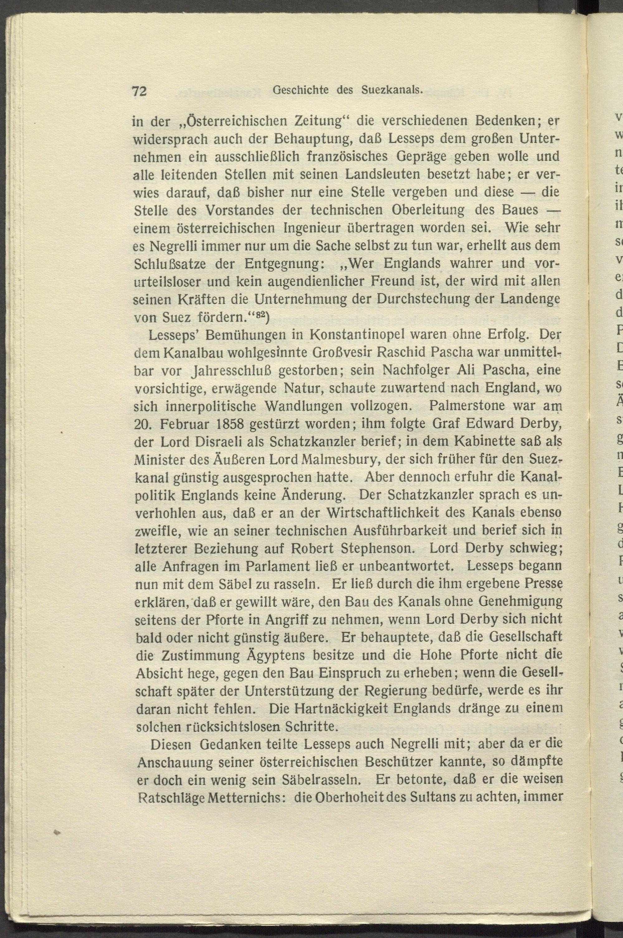 Lesseps’ Bemühungen in Konstantinopel waren ohne Erfolg. Der dem Kanalbau wohlgesinnte Großvesir Raschid Pascha war unmittel- bar vor Jahresschluß gestorben; sein Nachfolger Ali Pascha, eine vorsichtige, erwägende Natur, schaute zuwartend nach England, wo sich innerpolitische Wandlungen vollzogen. Palmerstone war am 20. Februar 1858 gestürzt worden; ihm folgte Graf Edward Derby, der Lord Disraeli als Schatzkanzler berief; in dem Kabinette saß als Minister des Äußeren Lord Malmesbury, der sich früher für den Suezr kanal günstig ausgesprochen hatte. Aber dennoch erfuhr die Kanalpolitik Englands keine Änderung. Der Schatzkanzler sprach es unverhohlen aus, daß er an der Wirtschaftlichkeit des Kanals ebenso zweifle, wie an seiner technischen Ausführbarkeit und berief sich in letzterer Beziehung auf Robert Stephenson. Lord Derby schwieg; alle Anfragen im Parlament ließ er unbeantwortet. Lesseps begann nun mit dem Säbel zu rasseln. Er ließ durch die ihm ergebene Presse erklären, daß er gewillt wäre, den Bau des Kanals ohne Genehmigung seitens der Pforte in Angriff zu nehmen, wenn Lord Derby sich nicht bald oder nicht günstig äußere. Er behauptete, daß die Gesellschaft die Zustimmung Ägyptens besitze und die Hohe Pforte nicht die Absicht hege, gegen den Bau Einspruch zu erheben; wenn die Gesellschaft später der Unterstützung der Regierung bedürfe, werde es ihr daran nicht fehlen. Die Hartnäckigkeit Englands dränge zu einem solchen rücksichtslosen Schritte.