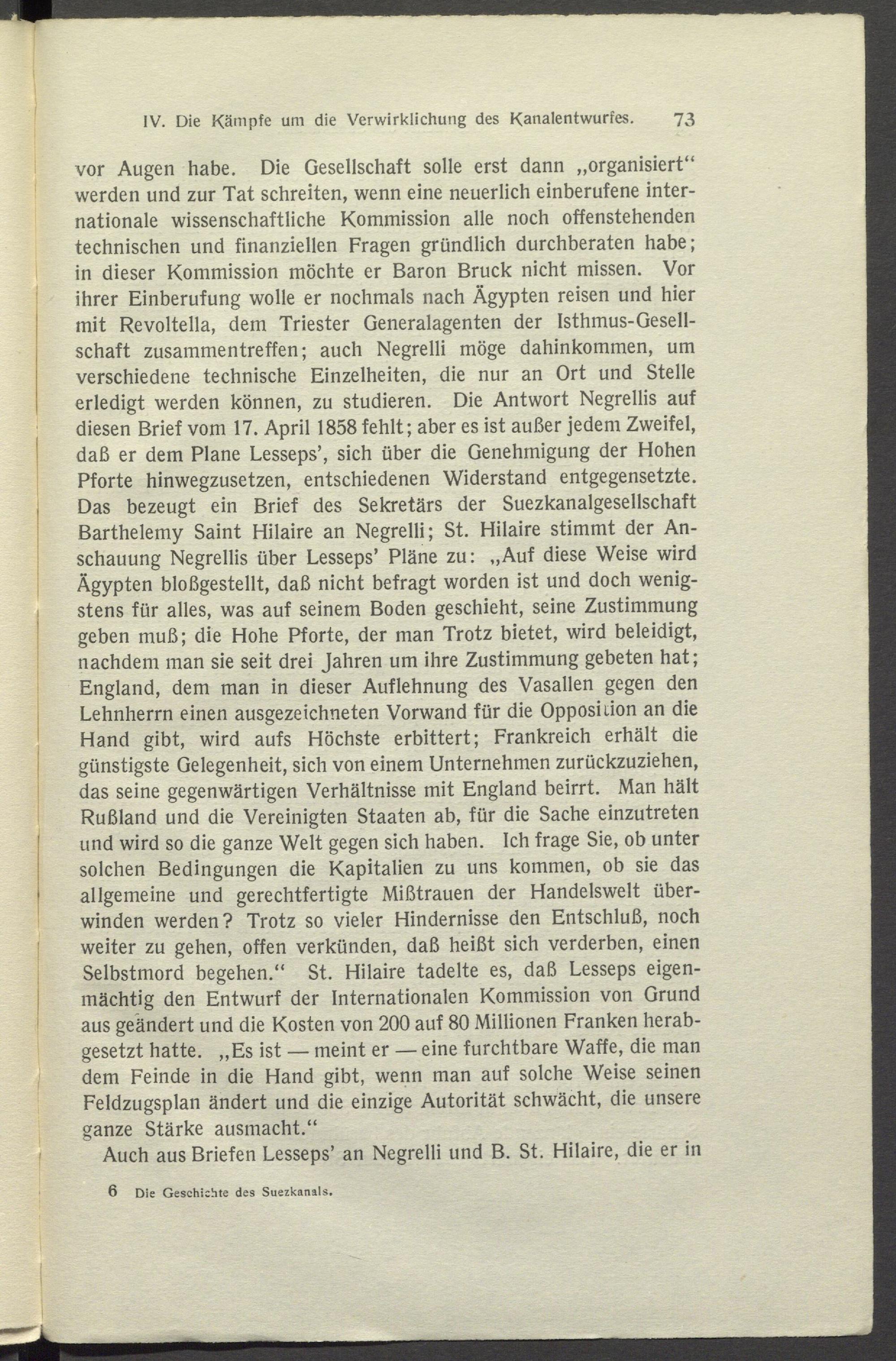 vor Augen habe. Die Gesellschaft solle erst dann „organisiert“ werden und zur Tat schreiten, wenn eine neuerlich einberufene internationale wissenschaftliche Kommission alle noch offenstehenden technischen und finanziellen Fragen gründlich durchberaten habe; in dieser Kommission möchte er Baron Bruck nicht missen. Vor ihrer Einberufung wolle er nochmals nach Ägypten reisen und hier mit Revoltella, dem Triester Generalagenten der Isthmus-Gesellschaft Zusammentreffen; auch Negrelli möge dahinkommen, um verschiedene technische Einzelheiten, die nur an Ort und Stelle erledigt werden können, zu studieren. Die Antwort Negrellis auf diesen Brief vom 17. April 1858 fehlt; aber es ist außer jedem Zweifel, daß er dem Plane Lesseps’, sich über die Genehmigung der Hohen Pforte hinwegzusetzen, entschiedenen Widerstand entgegensetzte. Das bezeugt ein Brief des Sekretärs der Suezkanalgesellschaft Barthelemy Saint Hilaire an Negrelli; St. Hilaire stimmt der Anschauung Negrellis über Lesseps’ Pläne zu: „Auf diese Weise wird Ägypten bloßgestellt, daß nicht befragt worden ist und doch wenigstens für alles, was auf seinem Boden geschieht, seine Zustimmung geben muß; die Hohe Pforte, der man Trotz bietet, wird beleidigt, nachdem man sie seit drei Jahren um ihre Zustimmung gebeten hat; England, dem man in dieser Auflehnung des Vasallen gegen den Lehnherrn einen ausgezeichneten Vorwand für die Opposition an die Hand gibt, wird aufs Höchste erbittert; Frankreich erhält die günstigste Gelegenheit, sich von einem Unternehmen zurückzuziehen, das seine gegenwärtigen Verhältnisse mit England beirrt. Man hält Rußland und die Vereinigten Staaten ab, für die Sache einzutreten und wird so die ganze Welt gegen sich haben. Ich frage Sie, ob unter solchen Bedingungen die Kapitalien zu uns kommen, ob sie das allgemeine und gerechtfertigte Mißtrauen der Handelswelt überwinden werden? Trotz so vieler Hindernisse den Entschluß, noch weiter zu gehen, offen verkünden, daß heißt sich verderben, einen Selbstmord begehen.“ St. Hilaire tadelte es, daß Lesseps eigenmächtig den Entwurf der Internationalen Kommission von Grund aus geändert und die Kosten von 200 auf 80 Millionen Franken herabgesetzt hatte. „Es ist — meint er — eine furchtbare Waffe, die man dem Feinde in die Hand gibt, wenn man auf solche Weise seinen Feldzugsplan ändert und die einzige Autorität schwächt, die unsere ganze Stärke ausmacht.“