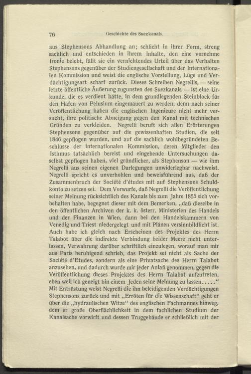 aus Stephensons Abhandlung an; schlicht in ihrer Form, streng sachlich und entschieden in ihrem Inhalte, den eine vornehme Ironie belebt, fällt sie ein vernichtendes Urteil über das Verhalten Stephensons gegenüber der Studiengesellschaft und der Internationalen Kommission und weist die englische Vorstellung, Lüge und Verdächtigungsart scharf zurück. Dieses Schreiben Negrellis, — seine letzte öffentliche Äußerung zugunsten des Suezkanals — ist eine Urkunde, die es verdient hätte, in dem grundlegenden Steinblock für den Hafen von Pelusium eingemauert zu werden, denn nach seiner Veröffentlichung haben die englischen Ingenieure nicht mehr versucht, ihre politische Abneigung gegen den Kanal mit technischen Gründen zu verkleiden. Negrelli beruft sich allen Erörterungen Stephensons gegenüber auf die gewissenhaften Studien, die seit 1846 gepflogen wurden, und auf die sachlich wohlbegründeten Beschlüsse der internationalen Kommission, deren Mitglieder den Isthmus tatsächlich bereist und eingehende Untersuchungen daselbst gepflogen haben, viel gründlicher, als Stephenson — wie ihm Negrelli aus seinen eigenen Darlegungen unwiderlegbar nachweist. Negrelli spricht es unverhohlen und beweisführend aus, daß der Zusammenbruch der Société d’études mit auf Stephensons Schuldkonto zu setzen sei. Dem Vorwurfe, daß Negrelli die Veröffentlichung seiner Meinung rücksichtlich des Kanals bis zum Jahre 1855 sich Vorbehalten habe, begegnet dieser mit dem Bemerken, „daß dieselbe in den öffentlichen Archiven der k. k. österr. Ministerien des Handels und der Finanzen in Wien, dann bei den Handelskammern von Venedig und Triest niedergelegt und mit Plänen versinnbildlicht ist. Auch habe ich gleich nach Erscheinen des Projektes des Herrn Talabot über die indirekte Verbindung beider Meere nicht unterlassen, Verwahrung darüber schriftlich einzulegen, worauf man mir aus Paris beruhigend schrieb, das Projekt sei nicht als Sache der Société d’Etudes, sondern als eine Privatsache des Herrn Talabot anzusehen, und dadurch wurde mir jeder Anlaß genommen, gegen die Veröffentlichung dieses Projektes des Herrn Talabot aufzutreten, eben weil ich geneigt bin einem Jeden seine Meinung zu lassen.... Mit Entrüstung weist Negrelli die ihn beleidigenden Verdächtigungen Stephensons zurück und mit „Erröten für die Wissenschaft“ geht er über die „hydraulischen Witze“ des englischen Fachmannes hinweg, dem er große Oberflächlichkeit in dem fachlichen Studium der Kanalsache vorwirft und dessen Truggebäude er schließlich mit der