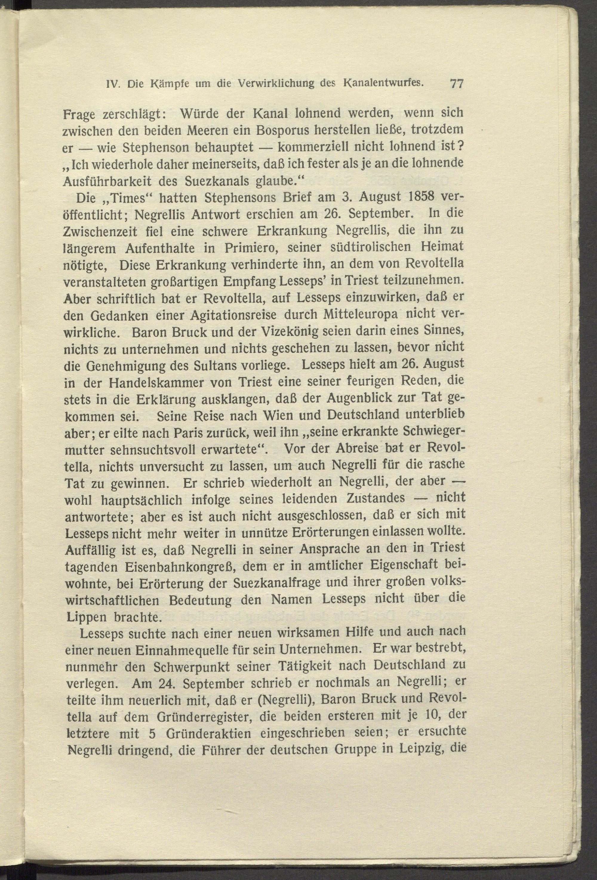 Die „Times“ hatten Stephensons Brief am 3. August 1858 veröffentlicht; Negrellis Antwort erschien am 26. September. In die Zwischenzeit fiel eine schwere Erkrankung Negrellis, die ihn zu längerem Aufenthalte in Primiero, seiner südtirolischen Heimat nötigte, Diese Erkrankung verhinderte ihn, an dem von Revoltella veranstalteten großartigen Empfang Lesseps’ in Triest teilzunehmen. Aber schriftlich bat er Revoltella, auf Lesseps einzuwirken, daß er den Gedanken einer Agitationsreise durch Mitteleuropa nicht verwirkliche. Baron Bruck und der Vizekönig seien darin eines Sinnes, nichts zu unternehmen und nichts geschehen zu lassen, bevor nicht die Genehmigung des Sultans vorliege. Lesseps hielt am 26. August in der Handelskammer von Triest eine seiner feurigen Reden, die stets in die Erklärung ausklangen, daß der Augenblick zur Tat gekommen sei. Seine Reise nach Wien und Deutschland unterblieb aber; er eilte nach Paris zurück, weil ihn „seine erkrankte Schwiegermutter sehnsuchtsvoll erwartete“. Vor der Abreise bat er Revoltella, nichts unversucht zu lassen, um auch Negrelli für die rasche Tat zu gewinnen. Er schrieb wiederholt an Negrelli, der aber — wohl hauptsächlich infolge seines leidenden Zustandes — nicht antwortete; aber es ist auch nicht ausgeschlossen, daß er sich mit Lesseps nicht mehr weiter in unnütze Erörterungen einlassen wollte. Auffällig ist es, daß Negrelli in seiner Ansprache an den in Triest tagenden Eisenbahnkongreß, dem er in amtlicher Eigenschaft beiwohnte, bei Erörterung der Suezkanalfrage und ihrer großen volkswirtschaftlichen Bedeutung den Namen Lesseps nicht über die Lippen brachte.