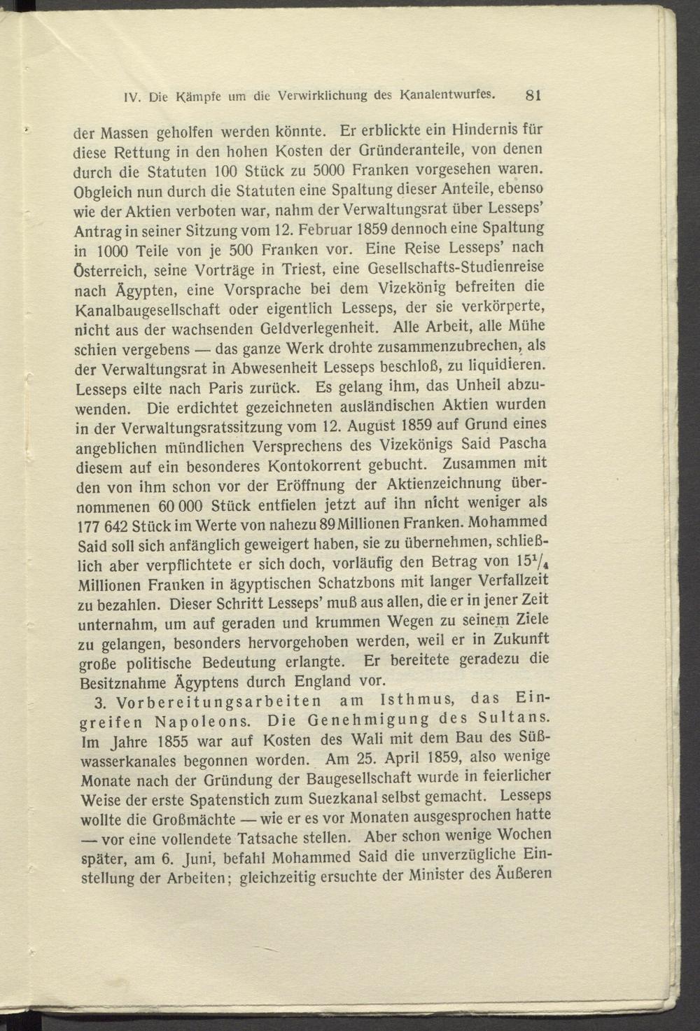 der Massen geholfen werden könnte. Er erblickte ein Hindernis für diese Rettung in den hohen Kosten der Gründeranteile, von denen durch die Statuten 100 Stück zu 5000 Franken vorgesehen waren. Obgleich nun durch die Statuten eine Spaltung dieser Anteile, ebenso wie der Aktien verboten war, nahm der Verwaltungsrat über Lesseps’ Antrag in seiner Sitzung vom 12. Februar 1859 dennoch eine Spaltung in 1000 Teile von je 500 Franken vor. Eine Reise Lesseps’ nach Österreich, seine Vorträge in Triest, eine Gesellschafts-Studienreise nach Ägypten, eine Vorsprache bei dem Vizekönig befreiten die Kanalbaugesellschaft oder eigentlich Lesseps, der sie verkörperte, nicht aus der wachsenden Geldverlegenheit. Alle Arbeit, alle Mühe schien vergebens — das ganze Werk drohte zusammenzubrechen, als der Verwaltungsrat in Abwesenheit Lesseps beschloß, zu liquidieren. Lesseps eilte nach Paris zurück. Es gelang ihm, das Unheil abzuwenden. Die erdichtet gezeichneten ausländischen Aktien wurden in der Verwaltungsratssitzung vom 12. August 1859 auf Grund eines angeblichen mündlichen Versprechens des Vizekönigs Said Pascha diesem auf ein besonderes Kontokorrent gebucht. Zusammen mit den von ihm schon vor der Eröffnung der Aktienzeichnung übernommenen 60 000 Stück entfielen jetzt auf ihn nicht weniger als 177 642 Stück im Werte von nahezu 89Millionen Franken. Mohammed Said soll sich anfänglich geweigert haben, sie zu übernehmen, schließlich aber verpflichtete er sich doch, vorläufig den Betrag von 15 1 /* Millionen Franken in ägyptischen Schatzbons mit langer Verfallzeit zu bezahlen. Dieser Schritt Lesseps’ muß aus allen, die er in jener Zeit unternahm, um auf geraden und krummen Wegen zu seinem Ziele zu gelangen, besonders hervorgehoben werden, weil er in Zukunft große politische Bedeutung erlangte. Er bereitete geradezu die Besitznahme Ägyptens durch England vor.
