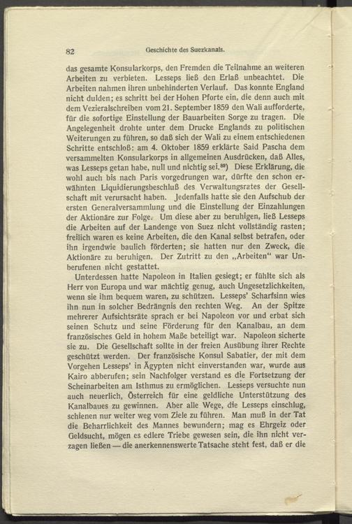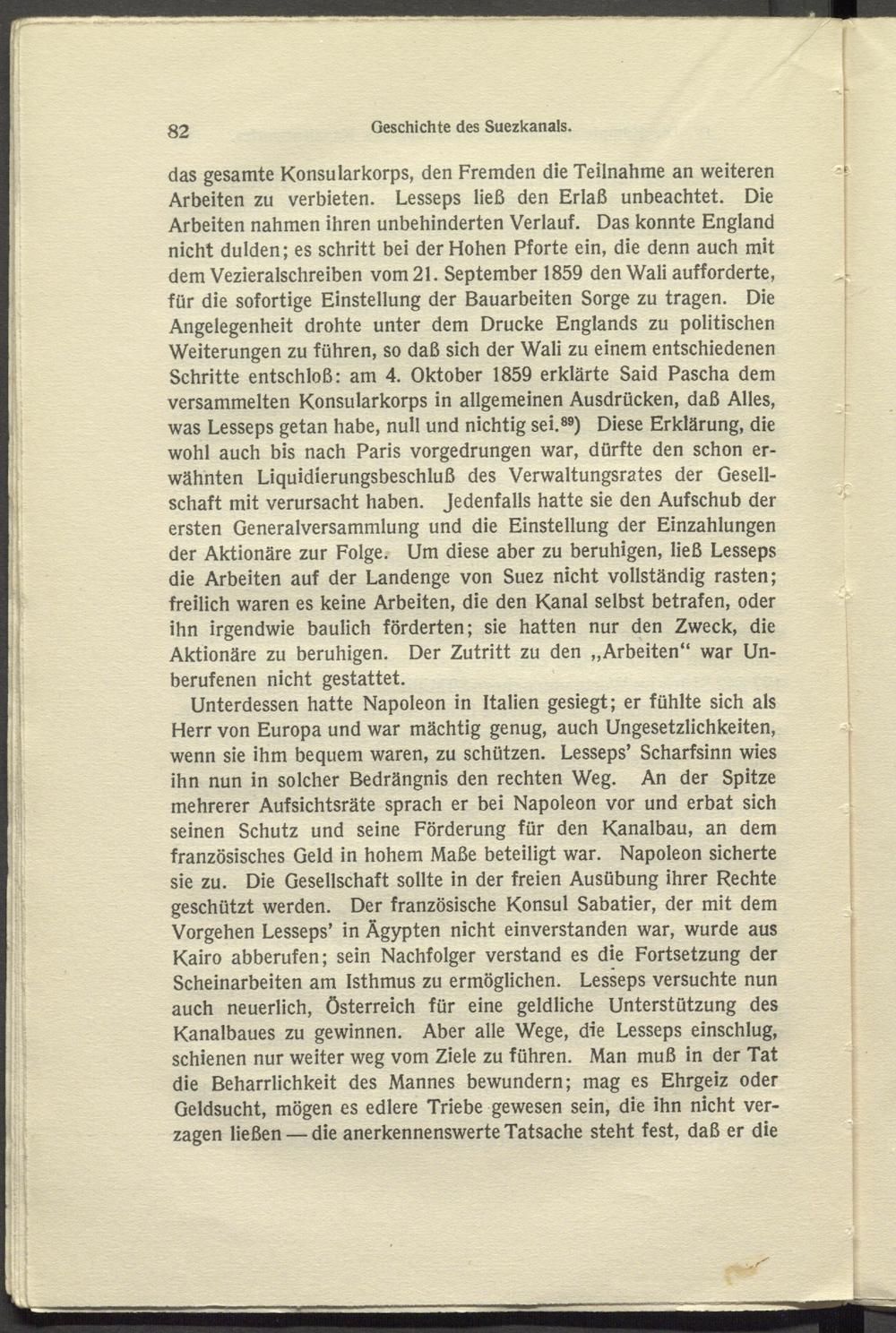 das gesamte Konsularkorps, den Fremden die Teilnahme an weiteren Arbeiten zu verbieten. Lesseps ließ den Erlaß unbeachtet. Die Arbeiten nahmen ihren unbehinderten Verlauf. Das konnte England nicht dulden; es schritt bei der Hohen Pforte ein, die denn auch mit dem Vezieralschreiben vom 21. September 1859 denWali aufforderte, für die sofortige Einstellung der Bauarbeiten Sorge zu tragen. Die Angelegenheit drohte unter dem Drucke Englands zu politischen Weiterungen zu führen, so daß sich der Wali zu einem entschiedenen Schritte entschloß: am 4. Oktober 1859 erklärte Said Pascha dem versammelten Konsularkorps in allgemeinen Ausdrücken, daß Alles, was Lesseps getan habe, null und nichtig sei. 89 ) Diese Erklärung, die wohl auch bis nach Paris vorgedrungen war, dürfte den schon erwähnten Liquidierungsbeschluß des Verwaltungsrates der Gesellschaft mit verursacht haben. Jedenfalls hatte sie den Aufschub der ersten Generalversammlung und die Einstellung der Einzahlungen der Aktionäre zur Folge. Um diese aber zu beruhigen, ließ Lesseps die Arbeiten auf der Landenge von Suez nicht vollständig rasten; freilich waren es keine Arbeiten, die den Kanal selbst betrafen, oder ihn irgendwie baulich förderten; sie hatten nur den Zweck, die Aktionäre zu beruhigen. Der Zutritt zu den „Arbeiten“ war Unberufenen nicht gestattet.
