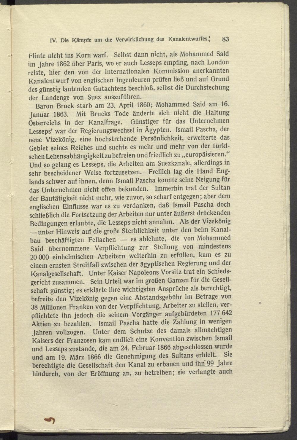 Baron Bruck starb am 23. April 1860; Mohammed Said am 16. Januar 1863. Mit Brucks Tode änderte sich nicht die Haltung Österreichs in der Kanalfrage. Günstiger für das Unternehmen Lesseps’ war der Regierungswechsel in Ägypten. Ismail Pascha, der neue Vizekönig, eine hochstrebende Persönlichkeit, erweiterte das Gebiet seines Reiches und suchte es mehr und mehr von der türkischen Lehensabhängigkeit zu befreien und friedlich zu „europäisieren.“ Und so gelang es Lesseps, die Arbeiten am Suezkanale, allerdings in sehr bescheidener Weise fortzusetzen. Freilich lag die Hand Englands schwer auf ihnen, denn Ismail Pascha konnte seine Neigung für das Unternehmen nicht offen bekunden. Immerhin trat der Sultan der Bautätigkeit nicht mehr, wie zuvor, so scharf entgegen; aber dem englischen Einflüsse war es zu verdanken, daß Ismail Pascha doch schließlich die Fortsetzung der Arbeiten nur unter äußerst drückenden Bedingungen erlaubte, die Lesseps nicht annahm. Als der Vizekönig — unter Hinweis auf die große Sterblichkeit unter den beim Kanalbau beschäftigten Fellachen — es ablehnte, die von Mohammed Said übernommene Verpflichtung zur Stellung von mindestens 20 000 einheimischen Arbeitern weiterhin zu erfüllen, kam es zu einem ernsten Streitfall zwischen der ägyptischen Regierung und der Kanalgesellschaft. Unter Kaiser Napoleons Vorsitz trat ein Schiedsgericht zusammen. Sein Urteil war im großen Ganzen für die Gesellschaft günstig; es erklärte ihre wichtigsten Ansprüche als berechtigt, befreite den Vizekönig gegen eine Abstandsgebühr im Betrage von 38 Millionen Franken von der Verpflichtung, Arbeiter zu stellen, verpflichtete ihn jedoch die seinem Vorgänger aufgebürdeten 177 642 Aktien zu bezahlen. Ismail Pascha hatte die Zahlung in wenigen Jahren vollzogen. Unter dem Schutze des damals allmächtigen Kaisers der Franzosen kam endlich eine Konvention zwischen Ismail und Lesseps zustande, die am 24. Februar 1866 abgeschlossen wurde und am 19. März 1866 die Genehmigung des Sultans erhielt. Sie berechtigte die Gesellschaft den Kanal zu erbauen und ihn 99 Jahre hindurch, von der Eröffnung an, zu betreiben; sie verlangte auch