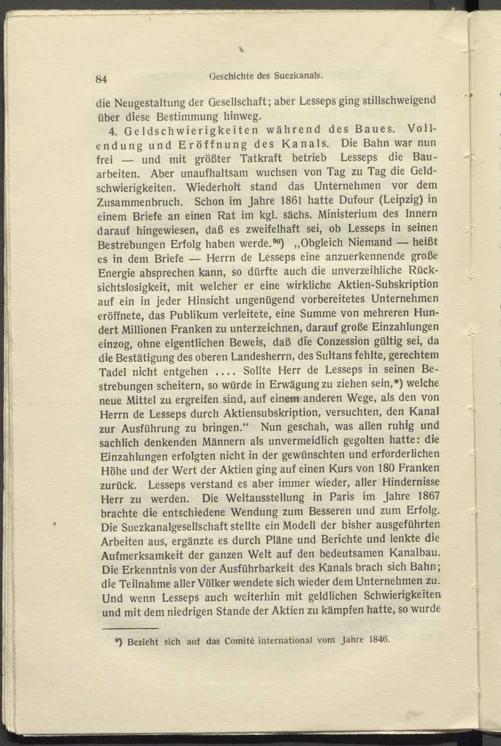 4. Geldschwierigkeiten während des Baues. Vollendung und Eröffnung des Kanals. Die Bahn war nun frei — und mit größter Tatkraft betrieb Lesseps die Bau- arbeiten. Aber unaufhaltsam wuchsen von Tag zu Tag die Geldschwierigkeiten. Wiederholt stand das Unternehmen vor dem Zusammenbruch. Schon im Jahre 1861 hatte Dufour (Leipzig) in einem Briefe an einen Rat im kgl. sächs. Ministerium des Innern darauf hingewiesen, daß es zweifelhaft sei, ob Lesseps in seinen Bestrebungen Erfolg haben werde. 90 ) „Obgleich Niemand — heißt es in dem Briefe — Herrn de Lesseps eine anzuerkennende große Energie absprechen kann, so dürfte auch die unverzeihliche Rücksichtslosigkeit, mit welcher er eine wirkliche Aktien-Subskription auf ein in jeder Hinsicht ungenügend vorbereitetes Unternehmen eröffnete, das Publikum verleitete, eine Summe von mehreren Hundert Millionen Franken zu unterzeichnen, darauf große Einzahlungen einzog, ohne eigentlichen Beweis, daß die Conzession gültig sei, da die Bestätigung des oberen Landesherrn, des Sultans fehlte, gerechtem Tadel nicht entgehen .... Sollte Herr de Lesseps in seinen Bestrebungen scheitern, so würde in Erwägung zu ziehen sein,*) welche neue Mittel zu ergreifen sind, auf einem anderen Wege, als den von Herrn de Lesseps durch Aktiensubskription, versuchten, den Kanal zur Ausführung zu bringen.“ Nun geschah, was allen ruhig und sachlich denkenden Männern als unvermeidlich gegolten hatte: die Einzahlungen erfolgten nicht in der gewünschten und erforderlichen Höhe und der Wert der Aktien ging auf einen Kurs von 180 Franken zurück. Lesseps verstand es aber immer wieder, aller Hindernisse Herr zu werden. Die Weltausstellung in Paris im Jahre 1867 brachte die entschiedene Wendung zum Besseren und zum Erfolg. Die Suezkanalgesellschaft stellte ein Modell der bisher ausgeführten Arbeiten aus, ergänzte es durch Pläne und Berichte und lenkte die Aufmerksamkeit der ganzen Welt auf den bedeutsamen Kanalbau. Die Erkenntnis von der Ausführbarkeit des Kanals brach sich Bahn; die Teilnahme aller Völker wendete sich wieder dem Unternehmen zu. Und wenn Lesseps auch weiterhin mit geldlichen Schwierigkeiten und mit dem niedrigen Stande der Aktien zu kämpfen hatte, so wurde