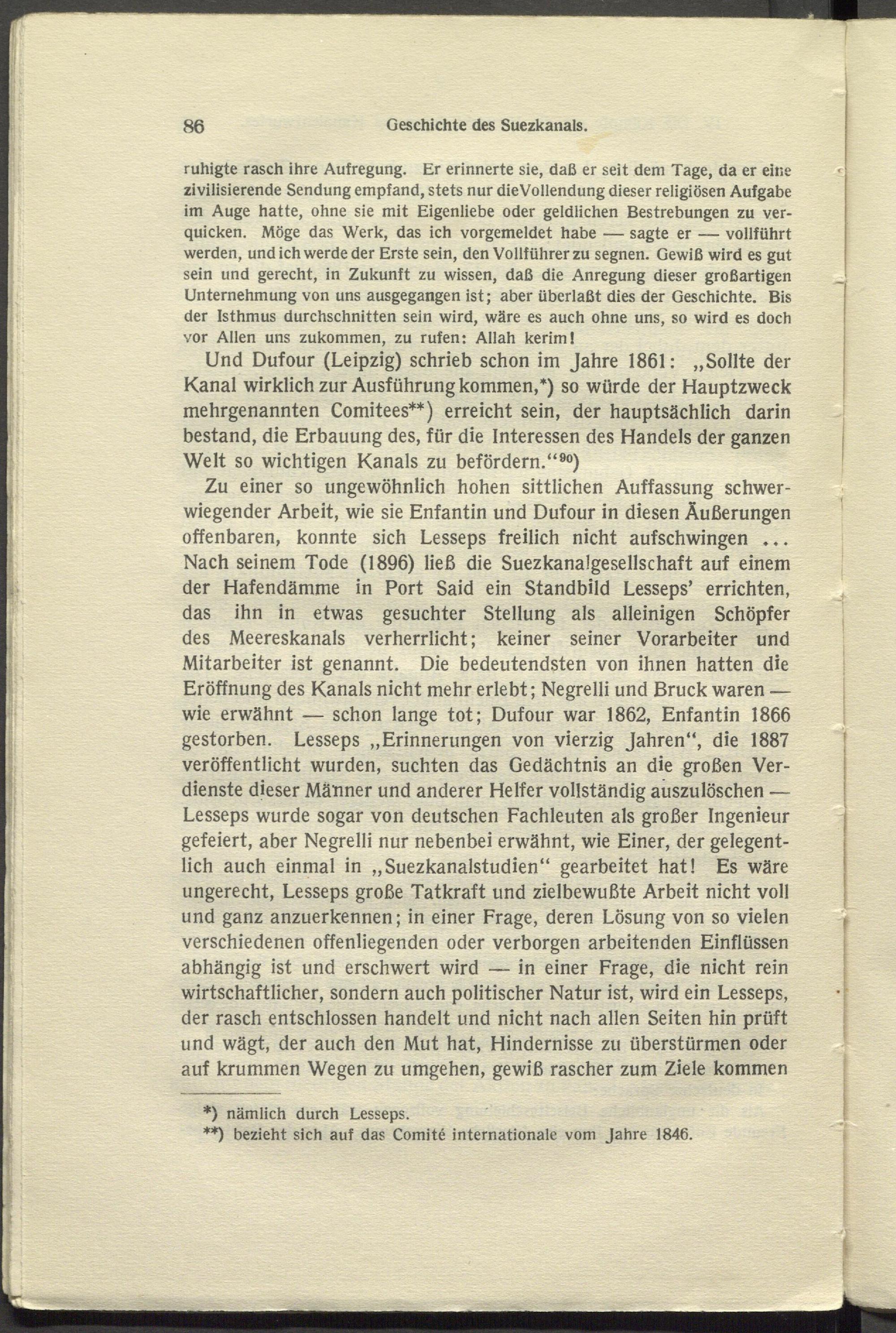 Und Dufour (Leipzig) schrieb schon im Jahre 1861: „Sollte der Kanal wirklich zur Ausführung kommen,*) so würde der Hauptzweck mehrgenannten Comitees**) erreicht sein, der hauptsächlich darin bestand, die Erbauung des, für die Interessen des Handels der ganzen Welt so wichtigen Kanals zu befördern.“ 90 )