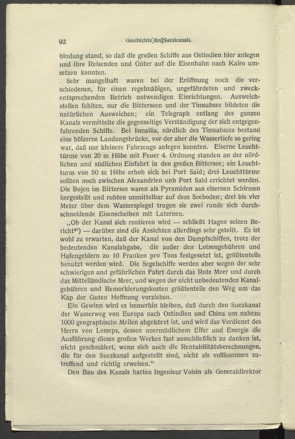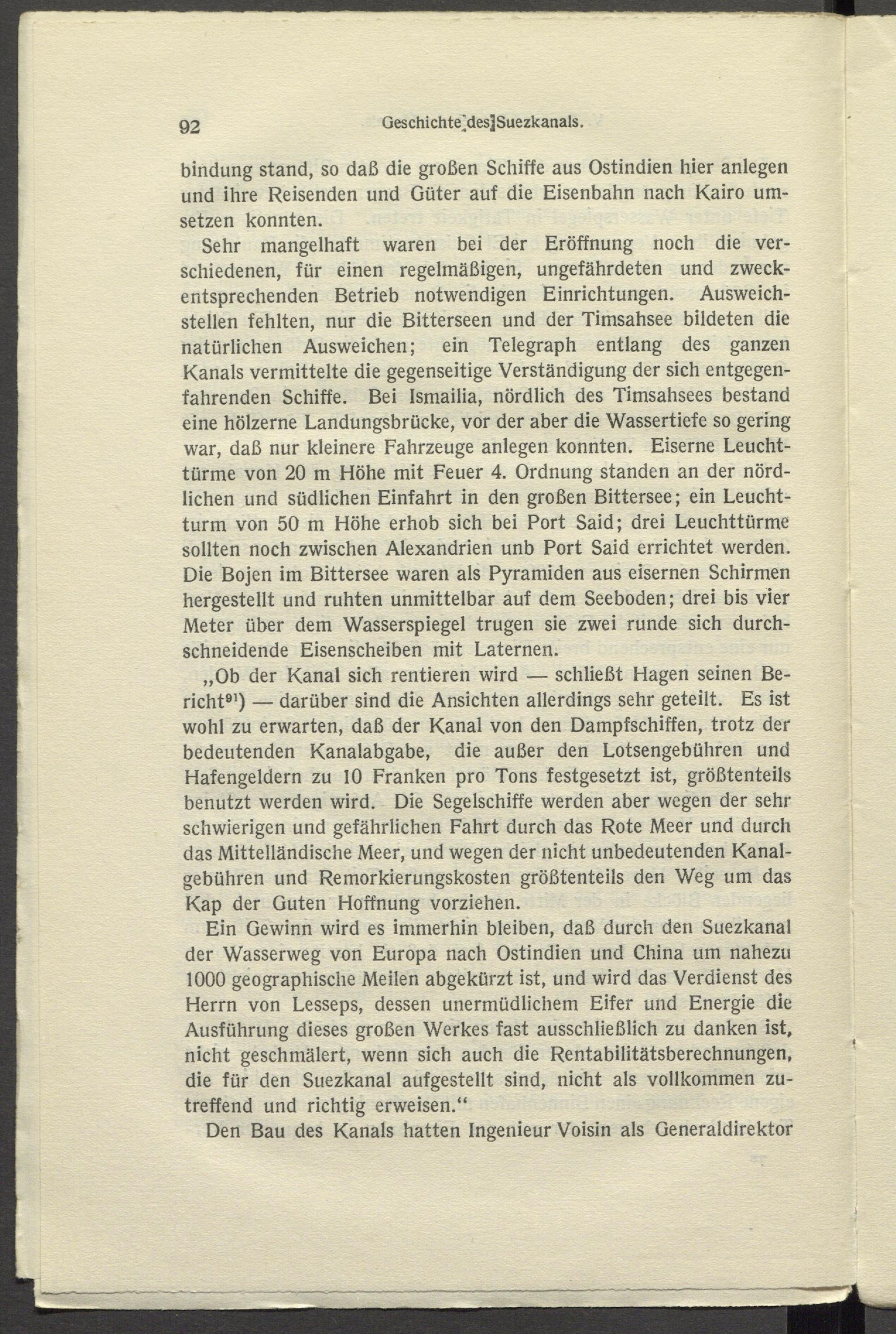 Ein Gewinn wird es immerhin bleiben, daß durch den Suezkanal der Wasserweg von Europa nach Ostindien und China um nahezu 1000 geographische Meilen abgekürzt ist, und wird das Verdienst des Herrn von Lesseps, dessen unermüdlichem Eifer und Energie die Ausführung dieses großen Werkes fast ausschließlich zu danken ist, nicht geschmälert, wenn sich auch die Rentabilitätsberechnungen, die für den Suezkanal aufgestellt sind, nicht als vollkommen zutreffend und richtig erweisen.“