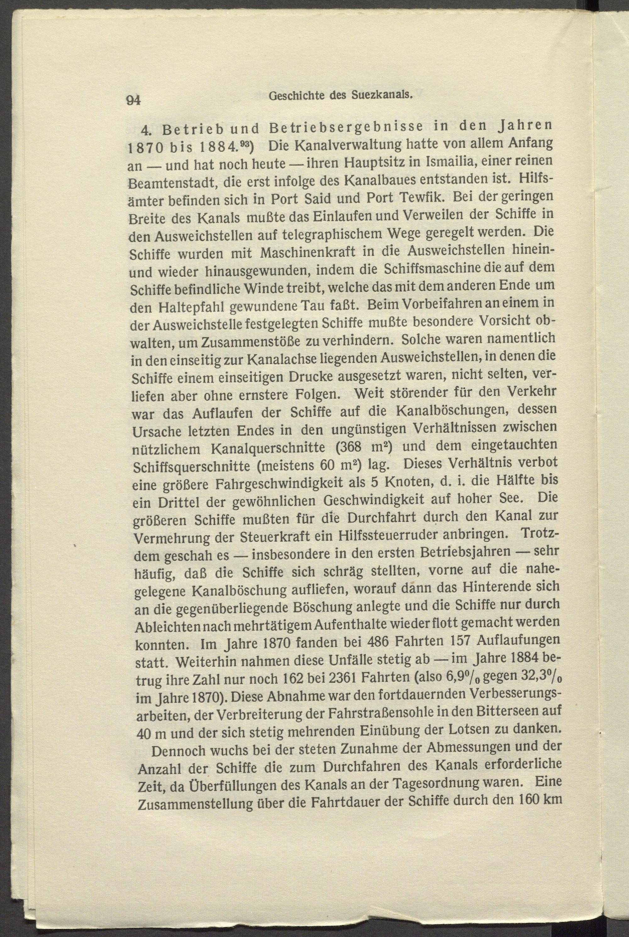 4. Betrieb und Betriebsergebnisse in den Jahren 1870 bis 1 884. 93 ) Die Kanalverwaltung hatte von allem Anfang an — und hat noch heute — ihren Hauptsitz in Ismailia, einer reinen Beamtenstadt, die erst infolge des Kanalbaues entstanden ist. Hilfsämter befinden sich in Port Said und Port Tewfik. Bei der geringen Breite des Kanals mußte das Einlaufen und Verweilen der Schiffe in den Ausweichstellen auf telegraphischem Wege geregelt werden. Die Schiffe wurden mit Maschinenkraft in die Ausweichstellen hinein- und wieder hinausgewunden, indem die Schiffsmaschine die auf dem Schiffe befindliche Winde treibt, welche das mit dem anderen Ende um den Haltepfahl gewundene Tau faßt. Beim Vorbeifahren an einem in der Ausweichstelle festgelegten Schiffe mußte besondere Vorsicht obwalten, um Zusammenstöße zu verhindern. Solche waren namentlich in den einseitig zur Kanalachse liegenden Ausweichstellen, in denen die Schiffe einem einseitigen Drucke ausgesetzt waren, nicht selten, verliefen aber ohne ernstere Folgen. Weit störender für den Verkehr war das Auflaufen der Schiffe auf die Kanalböschungen, dessen Ursache letzten Endes in den ungünstigen Verhältnissen zwischen nützlichem Kanalquerschnitte (368 m 2 ) und dem eingetauchten Schiffsquerschnitte (meistens 60 m 2 ) lag. Dieses Verhältnis verbot eine größere Fahrgeschwindigkeit als 5 Knoten, d. i. die Hälfte bis ein Drittel der gewöhnlichen Geschwindigkeit auf hoher See. Die größeren Schiffe mußten für die Durchfahrt durch den Kanal zur Vermehrung der Steuerkraft ein Hilfssteuerruder anbringen. Trotzdem geschah es — insbesondere in den ersten Betriebsjahren — sehr häufig, daß die Schiffe sich schräg stellten, vorne auf die nahegelegene Kanalböschung aufliefen, worauf dann das Hinterende sich an die gegenüberliegende Böschung anlegte und die Schiffe nur durch Ableichten nach mehrtätigem Aufenthalte wieder flott gemacht werden konnten. Im Jahre 1870 fanden bei 486 Fahrten 157 Auflaufungen statt. Weiterhin nahmen diese Unfälle stetig ab — im Jahre 1884 betrug ihre Zahl nur noch 162 bei 2361 Fahrten (also 6,9°/ 0 gegen 32,3°/ 0 im Jahre 1870). Diese Abnahme war den fortdauernden Verbesserungsarbeiten, der Verbreiterung der Fahrstraßensohle in den Bitterseen auf 40 m und der sich stetig mehrenden Einübung der Lotsen zu danken.