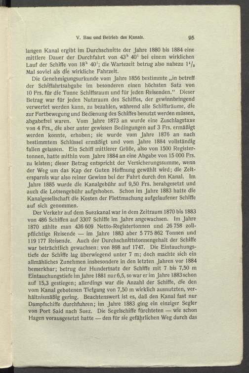 Der Verkehr auf dem Suezkanal war in dem Zeitraum 1870 bis 1883 von 486 Schiffen auf 3307 Schiffe im Jahre angewachsen. Im Jahre 1870 zählte man 436 609 Netto-Registertonnen und 26 758 zollpflichtige Reisende — im Jahre 1883 aber 5 775 862 Tonnen und 119 177 Reisende. Auch der Durchschnittstonnengehalt der Schiffe war beträchtlich gewachsen: von 898 auf 1747. Die Eintauchungstiefe der Schiffe lag überwiegend unter 7 m; doch machte sich ein allmähliches Zunehmen insbesondere in den letzten Jahren vor 1884 bemerkbar; betrug der Hundertsatz der Schiffe mit 7 bis 7,50 m Eintauchungstiefe im Jahre 1881 nur6,5, so warerim Jahre 1883 schon auf 15,3 gestiegen; allerdings war die Anzahl der Schiffe, die den vom Kanal gebotenen Tiefgang von 7,50 m wirklich ausnutzten, verhältnismäßig gering. Beachtenswert ist es, daß den Kanal fast nur Dampfschiffe durchfuhren; im Jahre 1883 ging ein einziger Segler von Port Said nach Suez. Die Segelschiffe fürchteten — wie schon Hagen vorausgesetzt hatte — den für sie gefährlichen Weg durch das