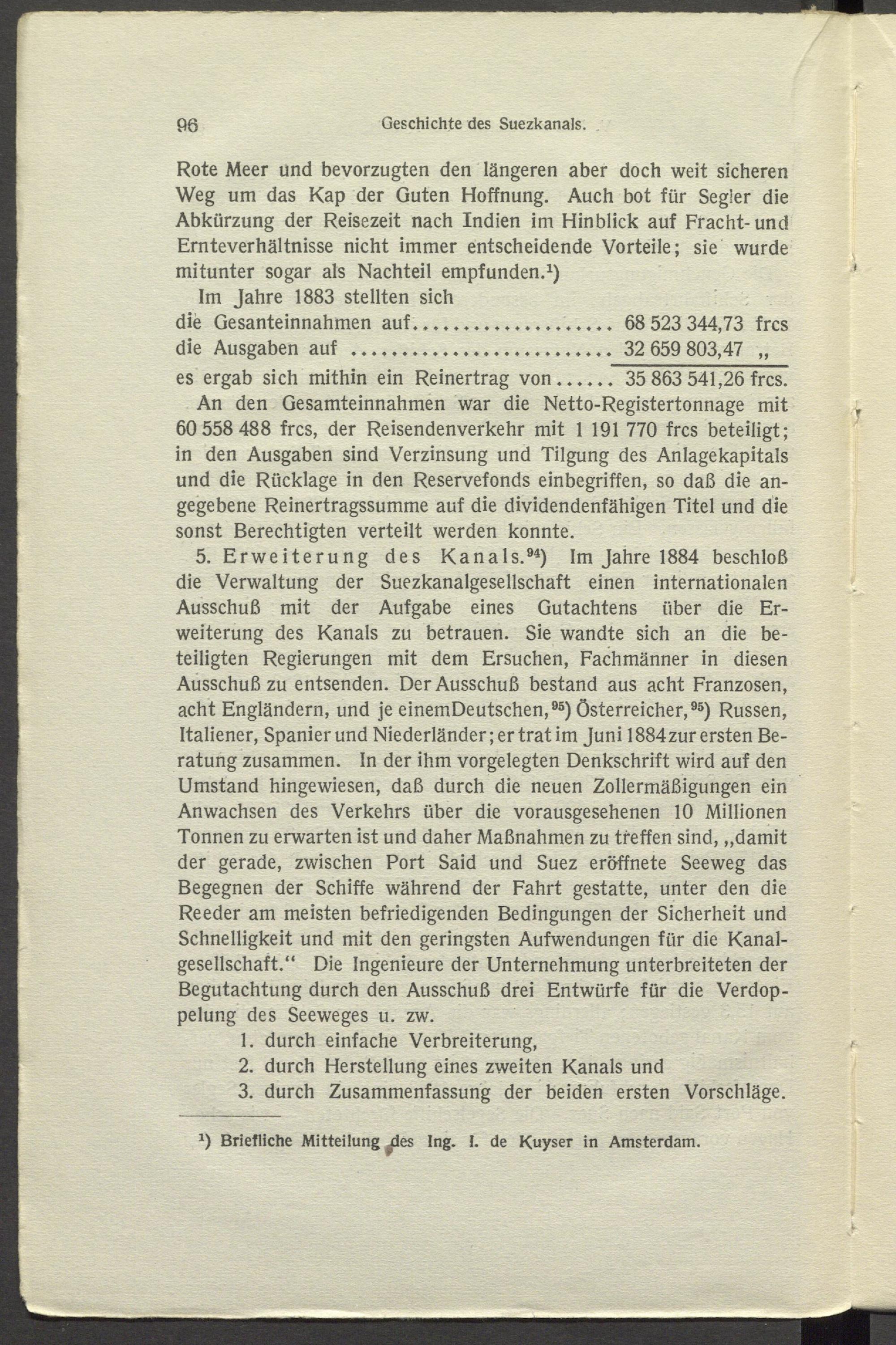 5. Erweiterung des Kanals. 94 ) Im Jahre 1884 beschloß die Verwaltung der Suezkanalgesellschaft einen internationalen Ausschuß mit der Aufgabe eines Gutachtens über die Erweiterung des Kanals zu betrauen. Sie wandte sich an die beteiligten Regierungen mit dem Ersuchen, Fachmänner in diesen Ausschußzu entsenden. Der Ausschuß bestand aus acht Franzosen, acht Engländern, und je einemDeutschen, 95 ) Österreicher, 95 ) Russen, Italiener, Spanierund Niederländer; er trat im Juni 1884 zur ersten Beratung zusammen. In der ihm vorgelegten Denkschrift wird auf den Umstand hingewiesen, daß durch die neuen Zollermäßigungen ein Anwachsen des Verkehrs über die vorausgesehenen 10 Millionen Tonnen zu erwarten ist und daher Maßnahmen zu treffen sind, „damit der gerade, zwischen Port Said und Suez eröffnete Seeweg das Begegnen der Schiffe während der Fahrt gestatte, unter den die Reeder am meisten befriedigenden Bedingungen der Sicherheit und Schnelligkeit und mit den geringsten Aufwendungen für die Kanalgesellschaft.“ Die Ingenieure der Unternehmung unterbreiteten der Begutachtung durch den Ausschuß drei Entwürfe für die Verdoppelung des Seeweges u. zw.