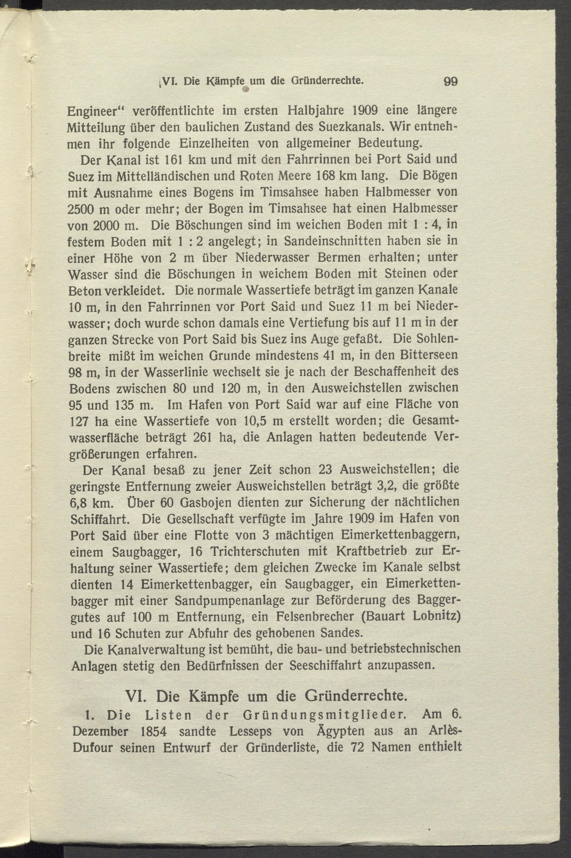 Der Kanal ist 161 km und mit den Fahrrinnen bei Port Said und Suez im Mittelländischen und Roten Meere 168 km lang. Die Bögen mit Ausnahme eines Bogens im Timsahsee haben Halbmesser von 2500 m oder mehr; der Bogen im Timsahsee hat einen Halbmesser von 2000 m. Die Böschungen sind im weichen Boden mit 1 :4, in festem Boden mit 1 :2 angelegt; in Sandeinschnitten haben sie in einer Höhe von 2 m über Niederwasser Bermen erhalten; unter Wasser sind die Böschungen in weichem Boden mit Steinen oder Beton verkleidet. Die normale Wassertiefe beträgt im ganzen Kanäle 10 m, in den Fahrrinnen vor Port Said und Suez 11 m bei Niederwasser; doch wurde schon damals eine Vertiefung bis auf 11 m in der ganzen Strecke von Port Said bis Suez ins Auge gefaßt. Die Sohlenbreite mißt im weichen Grunde mindestens 41 m, in den Bitterseen 98 m, in der Wasserlinie wechselt sie je nach der Beschaffenheit des Bodens zwischen 80 und 120 m, in den Ausweichstellen zwischen 95 und 135 m. Im Hafen von Port Said war auf eine Fläche von 127 ha eine Wassertiefe von 10,5 m erstellt worden; die Gesamtwasserfläche beträgt 261 ha, die Anlagen hatten bedeutende Vergrößerungen erfahren.