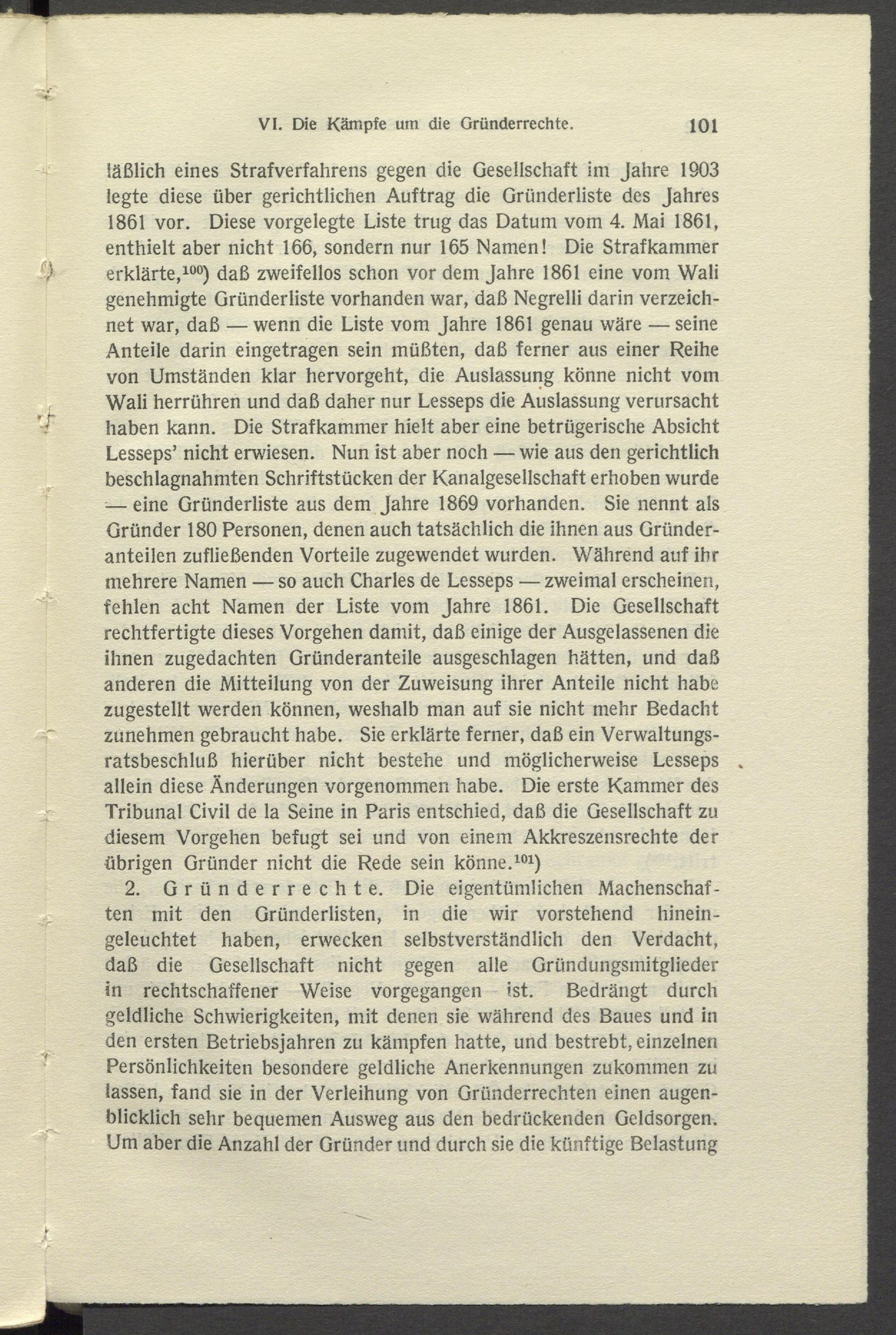 läßlich eines Strafverfahrens gegen die Gesellschaft im Jahre 1903 legte diese über gerichtlichen Auftrag die Gründerliste des Jahres 1861 vor. Diese vorgelegte Liste trug das Datum vom 4. Mai 1861, enthielt aber nicht 166, sondern nur 165 Namen! Die Strafkammer erklärte, 100 ) daß zweifellos schon vor dem Jahre 1861 eine vom Wali genehmigte Gründerliste vorhanden war, daß Negrelli darin verzeichnet war, daß — wenn die Liste vom Jahre 1861 genau wäre — seine Anteile darin eingetragen sein müßten, daß ferner aus einer Reihe von Umständen klar hervorgeht, die Auslassung könne nicht vom Wali herrühren und daß daher nur Lesseps die Auslassung verursacht haben kann. Die Strafkammer hielt aber eine betrügerische Absicht Lesseps’ nicht erwiesen. Nun ist aber noch — wie aus den gerichtlich beschlagnahmten Schriftstücken der Kanalgesellschaft erhoben wurde — eine Gründerliste aus dem Jahre 1869 vorhanden. Sie nennt als Gründer 180 Personen, denen auch tatsächlich die ihnen aus Gründeranteilen zufließenden Vorteile zugewendet wurden. Während auf ihr mehrere Namen —so auch Charles de Lesseps — zweimal erscheinen, fehlen acht Namen der Liste vom Jahre 1861. Die Gesellschaft rechtfertigte dieses Vorgehen damit, daß einige der Ausgelassenen die ihnen zugedachten Gründeranteile ausgeschlagen hätten, und daß anderen die Mitteilung von der Zuweisung ihrer Anteile nicht habe zugestellt werden können, weshalb man auf sie nicht mehr Bedacht zunehmen gebraucht habe. Sie erklärte ferner, daß ein Verwaltungsratsbeschluß hierüber nicht bestehe und möglicherweise Lesseps allein diese Änderungen vorgenommen habe. Die erste Kammer des Tribunal Civil de la Seine in Paris entschied, daß die Gesellschaft zu diesem Vorgehen befugt sei und von einem Akkreszensrechte der übrigen Gründer nicht die Rede sein könne. 101 )