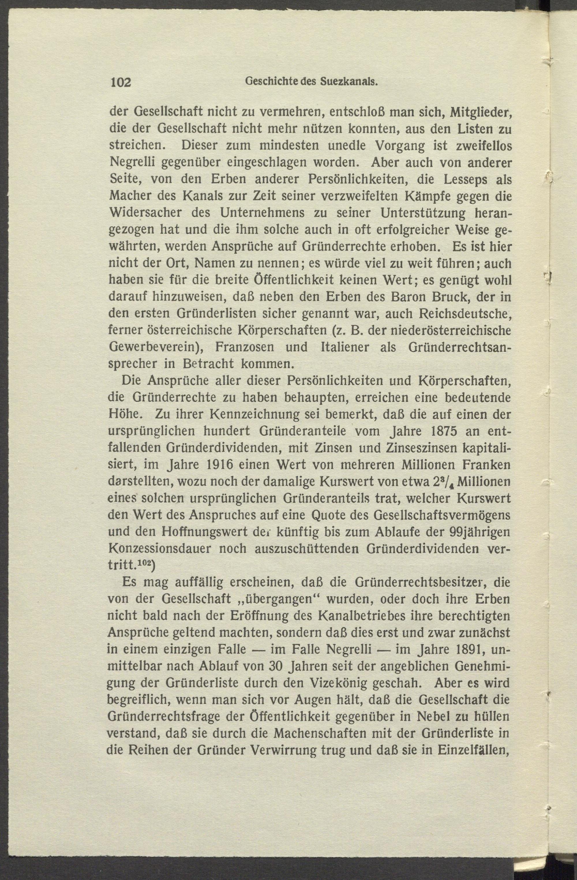 Die Ansprüche aller dieser Persönlichkeiten und Körperschaften, die Gründerrechte zu haben behaupten, erreichen eine bedeutende Höhe. Zu ihrer Kennzeichnung sei bemerkt, daß die auf einen der ursprünglichen hundert Gründeranteile vom Jahre 1875 an entfallenden Gründerdividenden, mit Zinsen und Zinseszinsen kapitalisiert, im Jahre 1916 einen Wert von mehreren Millionen Franken darstellten, wozu noch der damalige Kurswert von etwa 2 s / 4 Millionen eines solchen ursprünglichen Gründeranteils trat, welcher Kurswert den Wert des Anspruches auf eine Quote des Gesellschaftsvermögens und den Hoffnungswert der künftig bis zum Ablaufe der 99jährigen Konzessionsdauer noch auszuschüttenden Gründerdividenden vertritt. 102 )