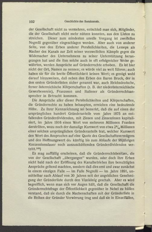 Es mag auffällig erscheinen, daß die Gründerrechtsbesitzer, die von der Gesellschaft „übergangen“ wurden, oder doch ihre Erben nicht bald nach der Eröffnung des Kanalbetriebes ihre berechtigten Ansprüche geltend machten, sondern daß dies erst und zwar zunächst in einem einzigen Falle — im Falle Negrelli — im Jahre 1891, unmittelbar nach Ablauf von 30 Jahren seit der angeblichen Genehmigung der Gründerliste durch den Vizekönig geschah. Aber es wird begreiflich, wenn man sich vor Augen hält, daß die Gesellschaft die Gründerrechtsfrage der Öffentlichkeit gegenüber in Nebel zu hüllen verstand, daß sie durch die Machenschaften mit der Gründerliste in die Reihen der Gründer Verwirrung trug und daß sie in Einzelfällen,