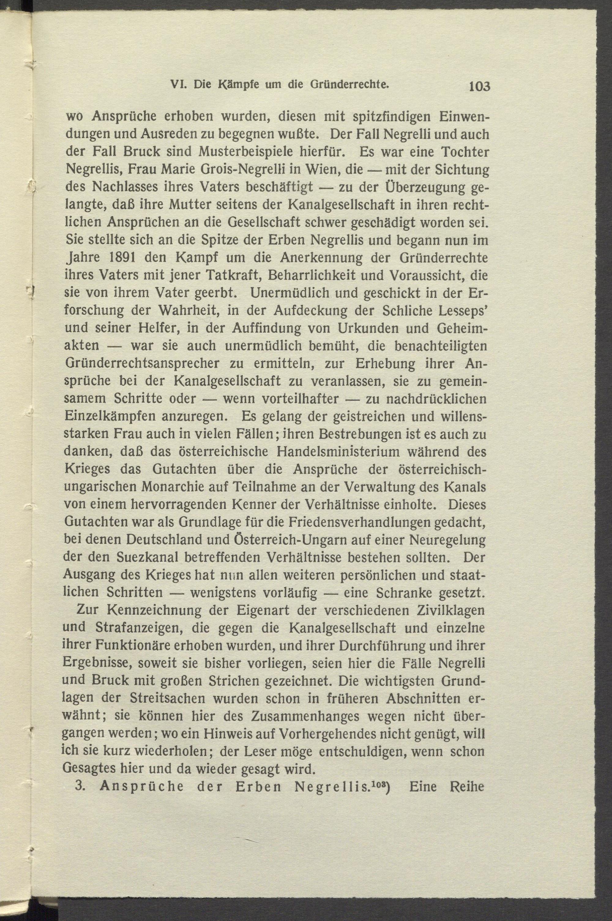 wo Ansprüche erhoben wurden, diesen mit spitzfindigen Einwendungen und Ausreden zu begegnen wußte. Der Fall Negrelli und auch der Fall Bruck sind Musterbeispiele hierfür. Es war eine Tochter Negrellis, Frau Marie Grois-Negrelli in Wien, die — mit der Sichtung des Nachlasses ihres Vaters beschäftigt — zu der Überzeugung gelangte, daß ihre Mutter seitens der Kanalgesellschaft in ihren rechtlichen Ansprüchen an die Gesellschaft schwer geschädigt worden sei. Sie stellte sich an die Spitze der Erben Negrellis und begann nun im Jahre 1891 den Kampf um die Anerkennung der Gründerrechte ihres Vaters mit jener Tatkraft, Beharrlichkeit und Voraussicht, die sie von ihrem Vater geerbt. Unermüdlich und geschickt in der Erforschung der Wahrheit, in der Aufdeckung der Schliche Lesseps’ und seiner Helfer, in der Auffindung von Urkunden und Geheimakten — war sie auch unermüdlich bemüht, die benachteiligten Gründerrechtsansprecher zu ermitteln, zur Erhebung ihrer Ansprüche bei der Kanalgesellschaft zu veranlassen, sie zu gemeinsamem Schritte oder — wenn vorteilhafter — zu nachdrücklichen Einzelkämpfen anzuregen. Es gelang der geistreichen und Willensstärken Frau auch in vielen Fällen; ihren Bestrebungen ist es auch zu danken, daß das österreichische Handelsministerium während des Krieges das Gutachten über die Ansprüche der österreichischungarischen Monarchie auf Teilnahme an der Verwaltung des Kanals von einem hervorragenden Kenner der Verhältnisse einholte. Dieses Gutachten war als Grundlage für die Friedensverhandlungen gedacht, bei denen Deutschland und Österreich-Ungarn auf einer Neuregelung der den Suezkanal betreffenden Verhältnisse bestehen sollten. Der Ausgang des Krieges hat nun allen weiteren persönlichen und staatlichen Schritten — wenigstens vorläufig — eine Schranke gesetzt.