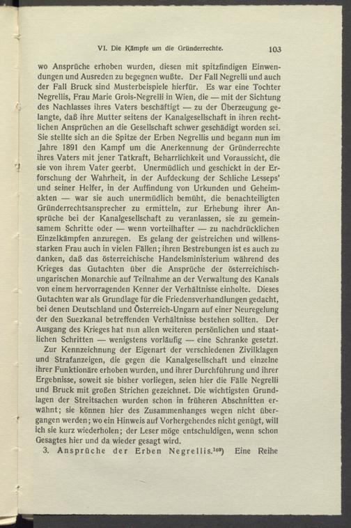 Zur Kennzeichnung der Eigenart der verschiedenen Zivilklagen und Strafanzeigen, die gegen die Kanalgesellschaft und einzelne ihrer Funktionäre erhoben wurden, und ihrer Durchführung und ihrer Ergebnisse, soweit sie bisher vorliegen, seien hier die Fälle Negrelli und Bruck mit großen Strichen gezeichnet. Die wichtigsten Grundlagen der Streitsachen wurden schon in früheren Abschnitten erwähnt; sie können hier des Zusammenhanges wegen nicht übergangen werden; wo ein Hinweis auf Vorhergehendes nicht genügt, will ich sie kurz wiederholen; der Leser möge entschuldigen, wenn schon Gesagtes hier und da wieder gesagt wird.