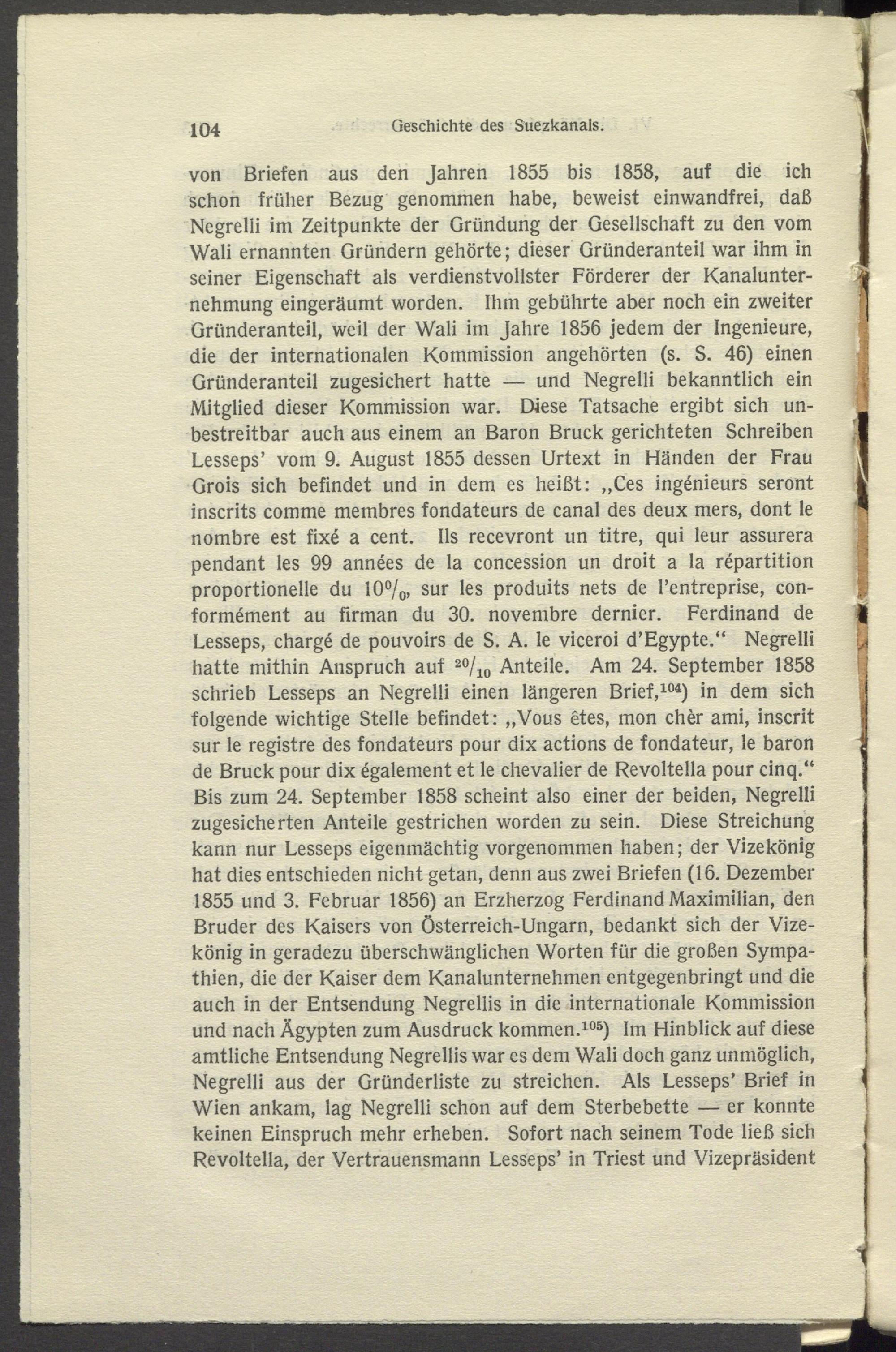 von Briefen aus den Jahren 1855 bis 1858, auf die ich schon früher Bezug genommen habe, beweist einwandfrei, daß Negrelii im Zeitpunkte der Gründung der Gesellschaft zu den vom Wali ernannten Gründern gehörte ; dieser Gründeranteil war ihm in seiner Eigenschaft als verdienstvollster Förderer der Kanalunternehmung eingeräumt worden. Ihm gebührte aber noch ein zweiter Gründeranteil, weil der Wali im Jahre 1856 jedem der Ingenieure, die der internationalen Kommission angehörten (s. S. 46) einen Gründeranteil zugesichert hatte — und Negrelii bekanntlich ein Mitglied dieser Kommission war. Diese Tatsache ergibt sich unbestreitbar auch aus einem an Baron Bruck gerichteten Schreiben Lesseps’ vom 9. August 1855 dessen Urtext in Händen der Frau Grois sich befindet und in dem es heißt: „Ces ingénieurs seront inscrits comme membres fondateurs de canal des deux mers, dont le nombre est fixé a cent. Ils recevront un titre, qui leur assurera pendant les 99 années de la concession un droit a la répartition proportionelle du 10%, sur les produits nets de l’entreprise, conformément au firman du 30. novembre dernier. Ferdinand de Lesseps, chargé de pouvoirs de S. A. le viceroi d’Egypte.“ Negrelii hatte mithin Anspruch auf 20 / 10 Anteile. Am 24. September 1858 schrieb Lesseps an Negrelii einen längeren Brief, 104 ) in dem sich folgende wichtige Stelle befindet: „Vous êtes, mon chèr ami, inscrit sur le registre des fondateurs pour dix actions de fondateur, le baron de Bruck pour dix également et le chevalier de Revoltella pour cinq.“ Bis zum 24. September 1858 scheint also einer der beiden, Negrelii zugesicherten Anteile gestrichen worden zu sein. Diese Streichung kann nur Lesseps eigenmächtig vorgenommen haben; der Vizekönig hat dies entschieden nicht getan, denn aus zwei Briefen (16. Dezember 1855 und 3. Februar 1856) an Erzherzog Ferdinand Maximilian, den Bruder des Kaisers von Österreich-Ungarn, bedankt sich der Vizekönig in geradezu überschwänglichen Worten für die großen Sympathien, die der Kaiser dem Kanalunternehmen entgegenbringt und die auch in der Entsendung Negrellis in die internationale Kommission und nach Ägypten zum Ausdruck kommen. 105 ) Im Hinblick auf diese amtliche Entsendung Negrellis war es dem Wali doch ganz unmöglich, Negrelii aus der Gründerliste zu streichen. Als Lesseps’ Brief in Wien ankam, lag Negrelii schon auf dem Sterbebette — er konnte keinen Einspruch mehr erheben. Sofort nach seinem Tode ließ sich Revoltella, der Vertrauensmann Lesseps’ in Triest und Vizepräsident