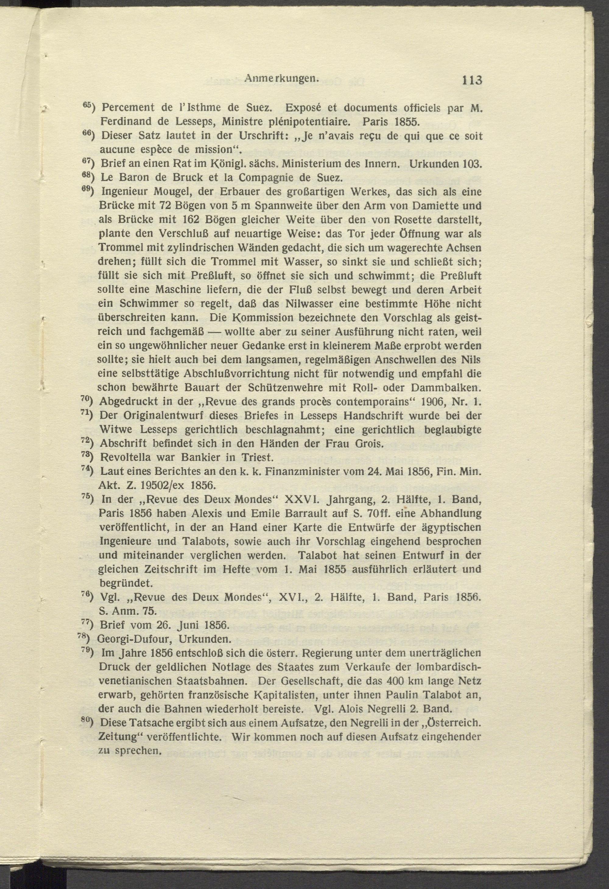 76 ) In der „Revue des Deux Mondes“ XXVI. Jahrgang, 2. Hälfte, 1. Band, Paris 1856 haben Alexis und Emile Barrault auf S. 70ff. eine Abhandlung veröffentlicht, in der an Hand einer Karte die Entwürfe der ägyptischen Ingenieure und Talabots, sowie auch ihr Vorschlag eingehend besprochen und miteinander verglichen werden. Talabot hat seinen Entwurf in der gleichen Zeitschrift im Hefte vom 1. Mai 1855 ausführlich erläutert und begründet.