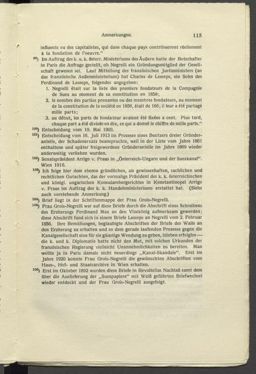 105 ) Frau Grois-Negrelli war auf diese Briefe durch die Abschrift eines Schreibens des Erzherzogs Ferdinand Max an den Vizekönig aufmerksam geworden; diese Abschrift fand sich in einem Briefe Lesseps an Negrelli vom 2. Februar 1856. Ihre Bemühungen, beglaubigte Abschriften der Briefe des Walis an den Erzherzog zu erhalten und so dem gerade laufenden Prozesse gegen die Kanalgesellschaft eine für sie günstige Wendung zu geben, blieben erfolglos — die k. und k. Diplomatie hatte nicht den Mut, mit solchen Urkunden der französischen Regierung vielleicht Unannehmlichkeiten zu bereiten. Man wollte ja in Paris damals nicht neuerdings „Kanal-Skandale“. Erst im Jahre 1920 konnte Frau Grois-Negrelli die gewünschten Abschriften vom Haus-, Hof- und Staatsarchive in Wien erhalten.