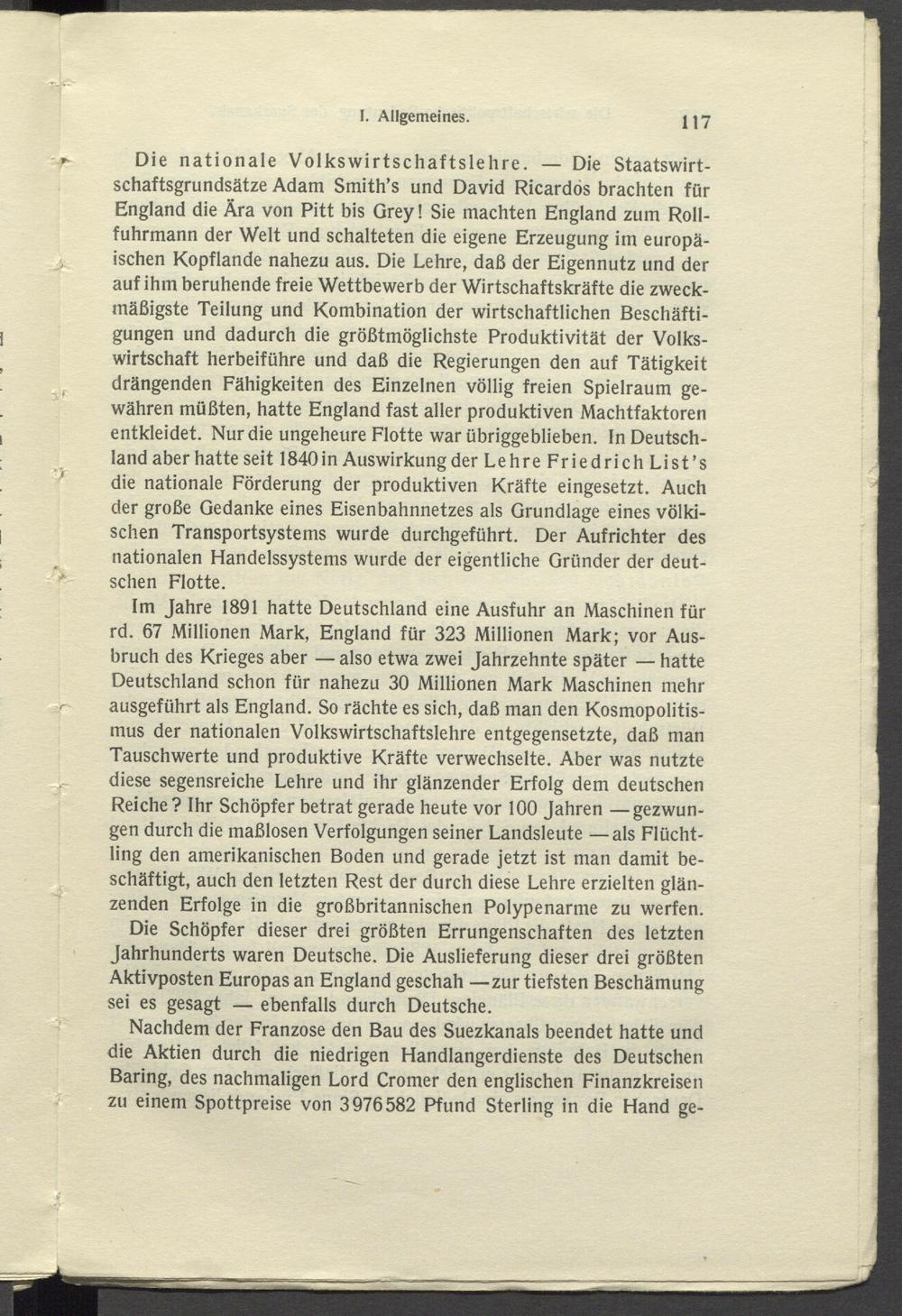 Im Jahre 1891 hatte Deutschland eine Ausfuhr an Maschinen für rd. 67 Millionen Mark, England für 323 Millionen Mark; vor Ausbruch des Krieges aber — also etwa zwei Jahrzehnte später — hatte Deutschland schon für nahezu 30 Millionen Mark Maschinen mehr ausgeführt als England. So rächte es sich, daß man den Kosmopolitismus der nationalen Volkswirtschaftslehre entgegensetzte, daß man Tauschwerte und produktive Kräfte verwechselte. Aber was nutzte diese segensreiche Lehre und ihr glänzender Erfolg dem deutschen Reiche? Ihr Schöpfer betrat gerade heute vor 100 Jahren —gezwungen durch die maßlosen Verfolgungen seiner Landsleute —als Flüchtling den amerikanischen Boden und gerade jetzt ist man damit beschäftigt, auch den letzten Rest der durch diese Lehre erzielten glänzenden Erfolge in die großbritannischen Polypenarme zu werfen.