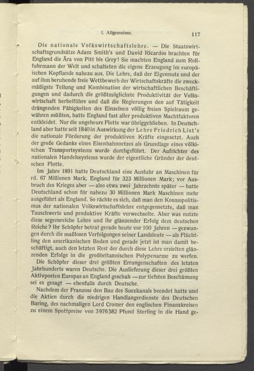 Die nationale Volkswirtschaftslehre. — Die Staatswirtschaftsgrundsätze Adam Smith’s und David Ricardos brachten für England die Ära von Pitt bis Grey! Sie machten England zum Rollfuhrmann der Welt und schalteten die eigene Erzeugung im europäischen Kopflande nahezu aus. Die Lehre, daß der Eigennutz und der auf ihm beruhende freie Wettbewerb der Wirtschaftskräfte die zweckmäßigste Teilung und Kombination der wirtschaftlichen Beschäftigungen und dadurch die größtmöglichste Produktivität der Volkswirtschaft herbeiführe und daß die Regierungen den auf Tätigkeit drängenden Fähigkeiten des Einzelnen völlig freien Spielraum gewähren müßten, hatte England fast aller produktiven Machtfaktoren entkleidet. Nur die ungeheure Flotte war übriggeblieben, ln Deutschland aber hatte seit 1840in Auswirkung der Lehre Friedrich List’s die nationale Förderung der produktiven Kräfte eingesetzt. Auch der große Gedanke eines Eisenbahnnetzes als Grundlage eines völkischen Transportsystems wurde durchgeführt. Der Aufrichter des nationalen Handelssystems wurde der eigentliche Gründer der deutschen Flotte.