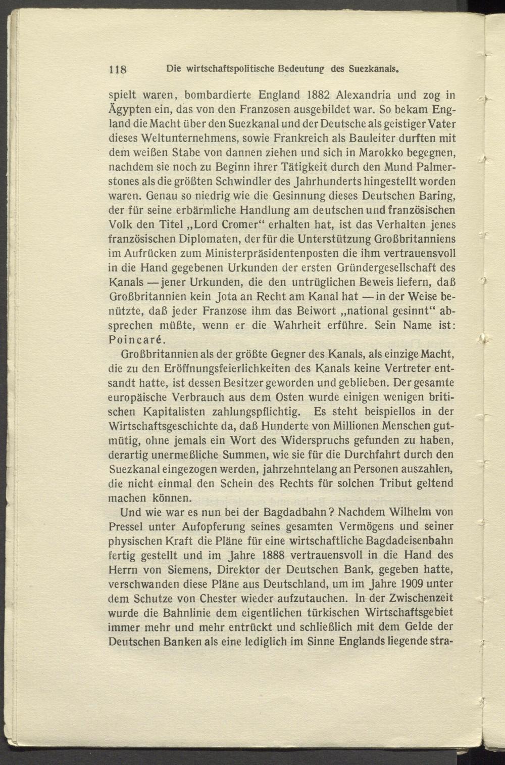 spielt waren, bombardierte England 1882 Alexandria und zog in Ägypten ein, das von den Franzosen ausgebildet war. So bekam England die Macht über den Suezkanal und der Deutsche als geistiger Vater dieses Weltunternehmens, sowie Frankreich als Bauleiter durften mit dem weißen Stabe von dannen ziehen und sich in Marokko begegnen, nachdem sie noch zu Beginn ihrer Tätigkeit durch den Mund Palmerstones als die größten Schwindler des Jahrhunderts hingestellt worden waren. Genau so niedrig wie die Gesinnung dieses Deutschen Baring, der für seine erbärmliche Handlung am deutschen und französischen Volk den Titel „Lord Cromer“ erhalten hat, ist das Verhalten jenes französischen Diplomaten, der für die Unterstützung Großbritanniens im Aufrücken zum Ministerpräsidentenposten die ihm vertrauensvoll in die Hand gegebenen Urkunden der ersten Gründergesellschaft des Kanals—jener Urkunden, die den untrüglichen Beweis liefern, daß Großbritannien kein Jota an Recht am Kanal hat —in der Weise benützte, daß jeder Franzose ihm das Beiwort „national gesinnt“ absprechen müßte, wenn er die Wahrheit erführe. Sein Name ist: Poincar6.