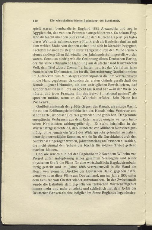 Großbritannien als der größte Gegner des Kanals, als einzige Macht, die zu den Eröffnungsfeierlichkeiten des Kanals keine Vertreter entsandt hatte, ist dessen Besitzer geworden und geblieben. Der gesamte europäische Verbrauch aus dem Osten wurde einigen wenigen britischen Kapitalisten zahlungspflichtig. Es steht beispiellos in der Wirtschaftsgeschichte da, daß Hunderte von Millionen Menschen gutmütig, ohne jemals ein Wort des Widerspruchs gefunden zu haben, derartig unermeßliche Summen, wie sie für die Durchfahrt durch den Suezkanal eingezogen werden, jahrzehntelang an Personen auszahlen, die nicht einmal den Schein des Rechts für solchen Tribut geltend machen können.