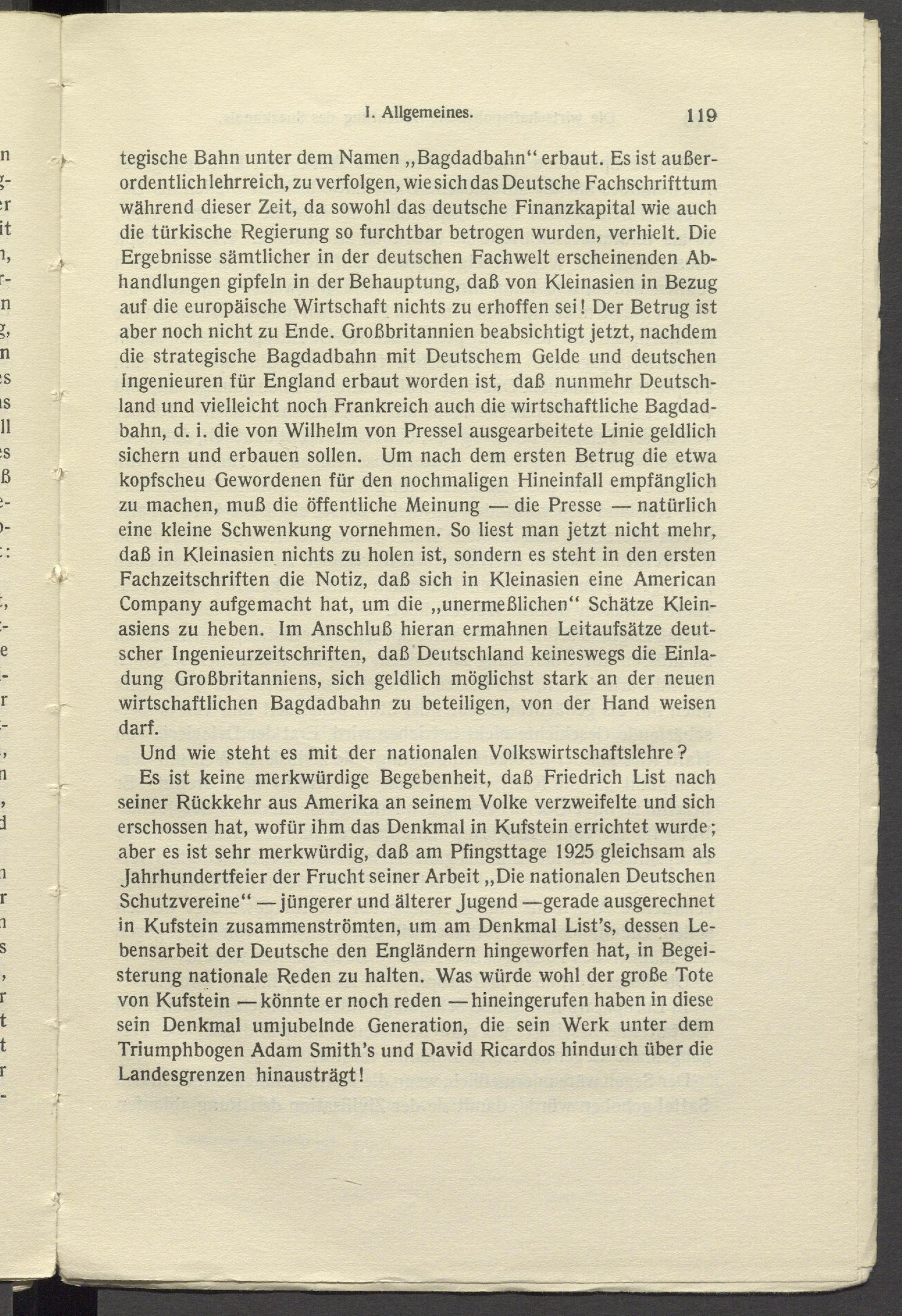 Es ist keine merkwürdige Begebenheit, daß Friedrich List nach seiner Rückkehr aus Amerika an seinem Volke verzweifelte und sich erschossen hat, wofür ihm das Denkmal in Kufstein errichtet wurde; aber es ist sehr merkwürdig, daß am Pfingsttage 1925 gleichsam als Jahrhundertfeier der Frucht seiner Arbeit „Die nationalen Deutschen Schutzvereine“ —jüngerer und älterer Jugend —gerade ausgerechnet in Kufstein zusammenströmten, um am Denkmal List’s, dessen Lebensarbeit der Deutsche den Engländern hingeworfen hat, in Begeisterung nationale Reden zu halten. Was würde wohl der große Tote von Kufstein —könnte er noch reden —hineingerufen haben in diese sein Denkmal umjubelnde Generation, die sein Werk unter dem Triumphbogen Adam Smith’s und David Ricardos hinduich über die Landesgrenzen hinausträgt!