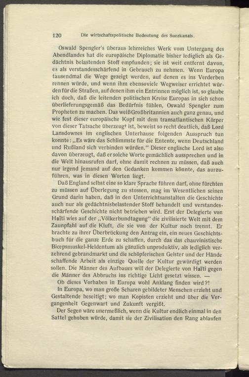 Oswald Spengler’s überaus lehrreiches Werk vom Untergang des Abendlandes hat die europäische Diplomatie bisher lediglich als Gedächtnis belastenden Stoff empfunden; sie ist weit entfernt davon, es als verstandesschärfend in Gebrauch zu nehmen. Wenn Europa tausendmal die Wege gezeigt werden, auf denen es ins Verderben rennen würde, und wenn ihm ebensoviele Wegweiser errichtet wür- denfür die Straßen, auf denen ihm ein Entrinnen möglich ist, so glaube ich doch, daß die leitenden politischen Kreise Europas in sich schon überlieferungsgemäß das Bedürfnis fühlen, Oswald Spengler zum Propheten zu machen. Das weißGroßbritannien auch ganz genau, und wie fest dieser europäische Kopf mit dem transatlantischen Körper von dieser Tatsache überzeugt ist, beweist so recht deutlich, daß Lord Lansdownes im englischen Unterhause folgenden Ausspruch tun konnte: „Es wäre das Schlimmste für die Entente, wenn Deutschland und Rußland sich verbinden würden.“ Dieser englische Lord ist also davon überzeugt, daß er solche Worte gemächlich aussprechen und in die Welt hinausrufen darf, ohne damit rechnen zu müssen, daß auch nur irgend jemand auf den Gedanken kommen könnte, das auszuführen, was in diesen Worten liegt.