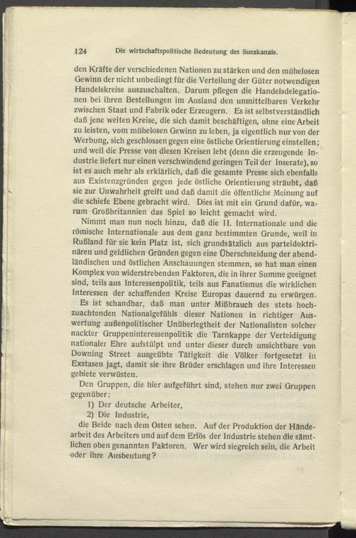 den Kräfte der verschiedenen Nationen zu stärken und den mühelosen Gewinn der nicht unbedingt für die Verteilung der Güter notwendigen Handelskreise auszuschalten. Darum pflegen die Handelsdelegationen bei ihren Bestellungen im Ausland den unmittelbaren Verkehr zwischen Staat und Fabrik oder Erzeugern. Es ist selbstverständlich daß jene weiten Kreise, die sich damit beschäftigen, ohne eine Arbeit zu leisten, vom mühelosen Gewinn zu leben, ja eigentlich nur von der Werbung, sich geschlossen gegen eine östliche Orientierung einstellen; und weil die Presse von diesen Kreisen lebt (denn die erzeugende Industrie liefert nur einen verschwindend geringen Teil der Inserate), so ist es auch mehr als erklärlich, daß die gesamte Presse sich ebenfalls aus Existenzgründen gegen jede östliche Orientieiung sträubt, daß sie zur Unwahrheit greift und daß damit die öffentliche Meinung auf die schiefe Ebene gebracht wird. Dies ist mit ein Grund dafür, warum Großbritannien das Spiel so leicht gemacht wird.