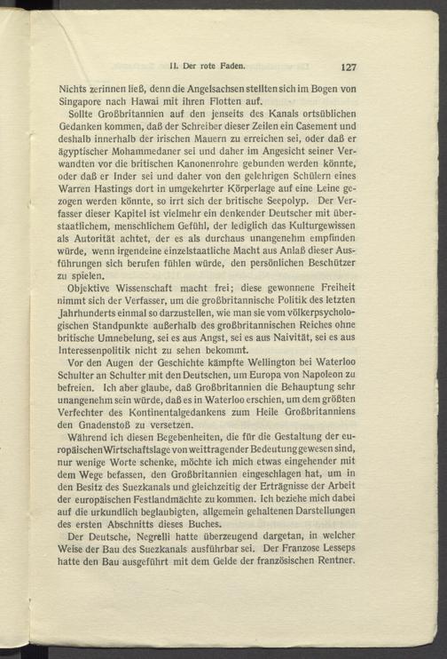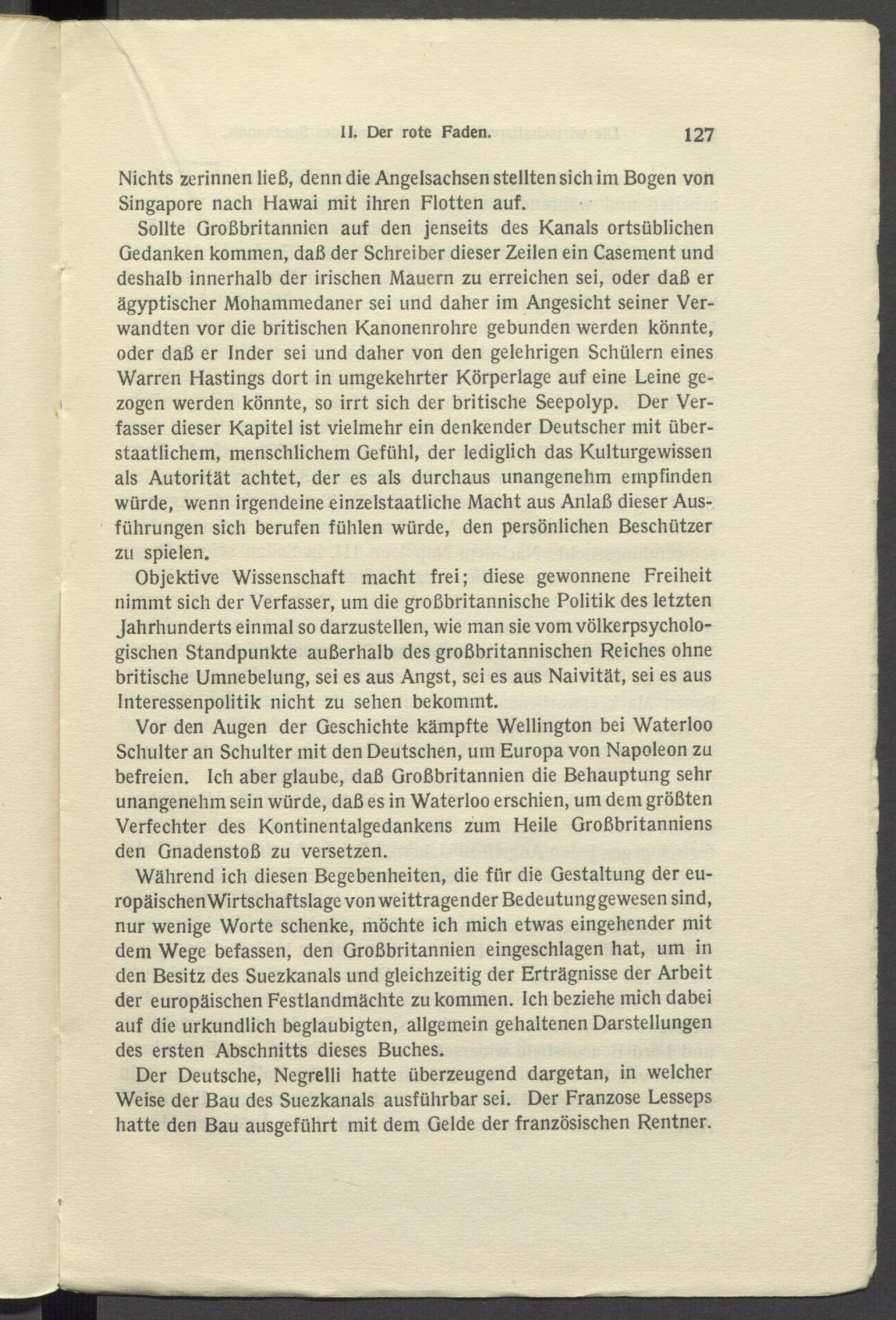 Sollte Großbritannien auf den jenseits des Kanals ortsüblichen Gedanken kommen, daß der Schreiber dieser Zeilen ein Casement und deshalb innerhalb der irischen Mauern zu erreichen sei, oder daß er ägyptischer Mohammedaner sei und daher im Angesicht seiner Verwandten vor die britischen Kanonenrohre gebunden werden könnte, oder daß er Inder sei und daher von den gelehrigen Schülern eines Warren Hastings dort in umgekehrter Körperlage auf eine Leine gezogen werden könnte, so irrt sich der britische Seepolyp. Der Verfasser dieser Kapitel ist vielmehr ein denkender Deutscher mit überstaatlichem, menschlichem Gefühl, der lediglich das Kulturgewissen als Autorität achtet, der es als durchaus unangenehm empfinden würde, wenn irgendeine einzelstaatliche Macht aus Anlaß dieser Ausführungen sich berufen fühlen würde, den persönlichen Beschützer zu spielen.