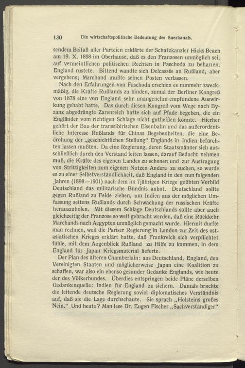 Der Plan des älteren Chamberlain: aus Deutschland, England, den Vereinigten Staaten und möglicherweise Japan eine Koalition zu schaffen, war also ein ebenso gesunder Gedanke Englands, wie heute der des Völkerbundes. Überdies entspringen beide Pläne derselben Gedankenquelle: Indien für England zu sichern. Damals brachte die leitende deutsche Regierung soviel diplomatisches Verständnis auf, daß sie die Lage durchschaute. Sie sprach „Holsteins großes Nein.“ Und heute ? Man lese Dr. Eugen Fischer „Sachverständiger“