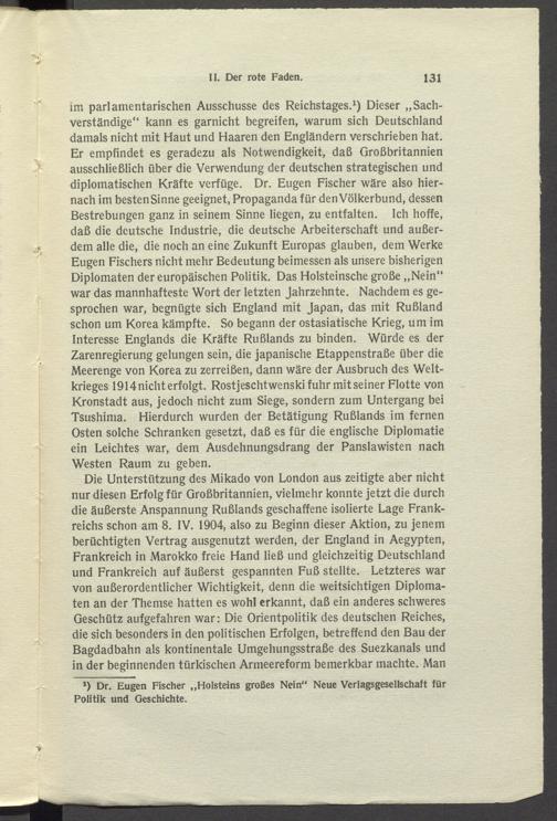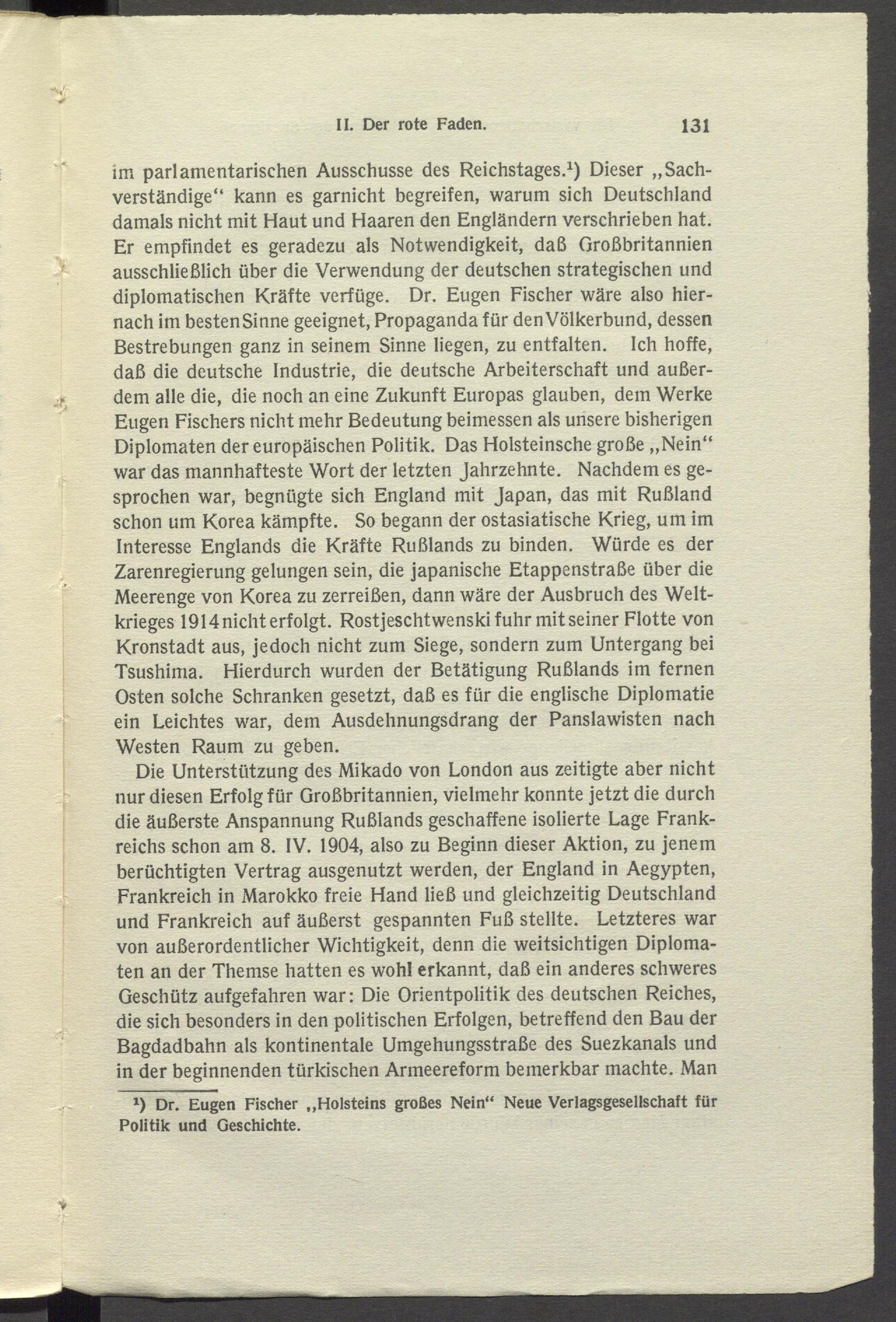 im parlamentarischen Ausschüsse des Reichstages. 1 ) Dieser „Sachverständige“ kann es garnicht begreifen, warum sich Deutschland damals nicht mit Haut und Haaren den Engländern verschrieben hat. Er empfindet es geradezu als Notwendigkeit, daß Großbritannien ausschließlich über die Verwendung der deutschen strategischen und diplomatischen Kräfte verfüge. Dr. Eugen Fischer wäre also hiernach im besten Sinne geeignet, Propaganda für den Völkerbund, dessen Bestrebungen ganz in seinem Sinne liegen, zu entfalten. Ich hoffe, daß die deutsche Industrie, die deutsche Arbeiterschaft und außerdem alle die, die noch an eine Zukunft Europas glauben, dem Werke Eugen Fischers nicht mehr Bedeutung beimessen als unsere bisherigen Diplomaten der europäischen Politik. Das Holsteinsche große „Nein“ war das mannhafteste Wort der letzten Jahrzehnte. Nachdem es gesprochen war, begnügte sich England mit Japan, das mit Rußland schon um Korea kämpfte. So begann der ostasiatische Krieg, um im Interesse Englands die Kräfte Rußlands zu binden. Würde es der Zarenregierung gelungen sein, die japanische Etappenstraße über die Meerenge von Korea zu zerreißen, dann wäre der Ausbruch des Weltkrieges 1914 nicht erfolgt. Rostjeschtwenski fuhr mit seiner Flotte von Kronstadt aus, jedoch nicht zum Siege, sondern zum Untergang bei Tsushima. Hierdurch wurden der Betätigung Rußlands im fernen Osten solche Schranken gesetzt, daß es für die englische Diplomatie ein Leichtes war, dem Ausdehnungsdrang der Panslawisten nach Westen Raum zu geben.